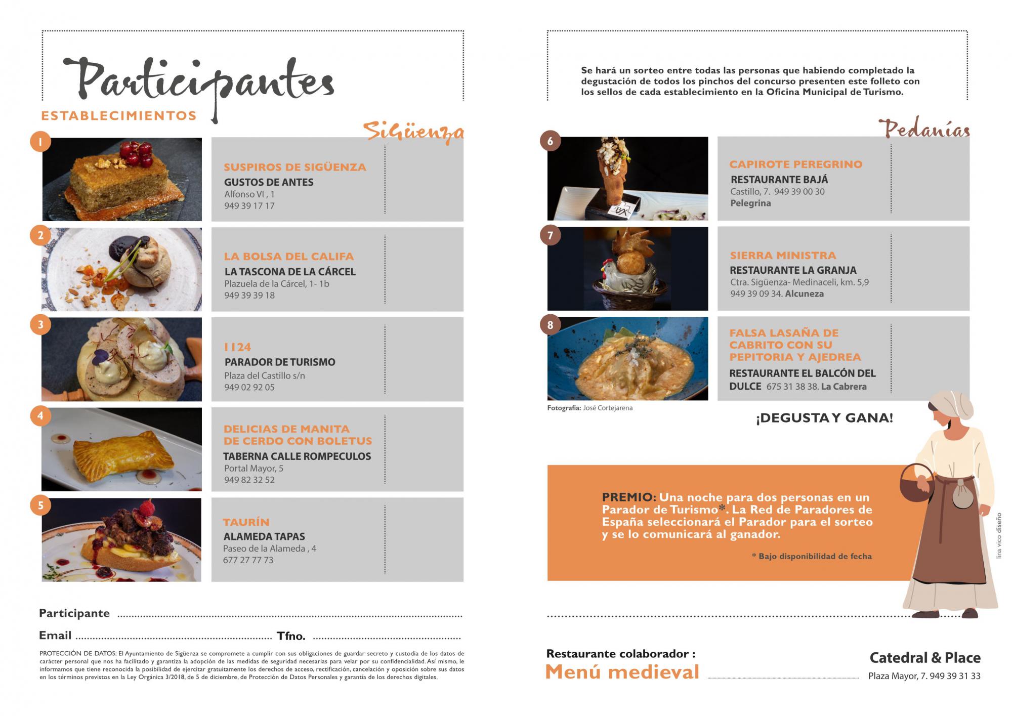 La propuesta de Abdellah Jraifi (Bar Alameda) es 'Taurin', puesto que el ingrediente que le da sentido al pincho es el rabo de toro. Miguel Soriano (La Tascona de la Cárcel) presenta 'La bolsa del Califa', con el cordero como ingrediente principal al que dátiles, piñones y otros sutiles aderezos darán un toque especial. Pablo de Francisco (El Balcón del Dulce-La Cabrera) presenta a concurso este año una 'Falsa lasaña de cabrito con su pepitoria y ajedrea', haciendo gala de las buenas carnes que se comen siempre en Sigüenza, y utilizando para ello especias de la tierra y queso de cabra. Irene Gómez Perdigón presentará, por primera vez, un pincho dulce a concurso. Lo ha llamado 'Suspiros de Sigüenza', utilizando para ello productos emblemáticos, como harina de centeno de espelta, miel de Sigüenza, sal de Saelices de la Sal, tomillo y romero locales y grosellas de Medinaceli. Finalmente, el último vencedor del concurso, Rubén Urbano se ha decantado este año por un '1124', en clara alusión a la reconquista de Sigüenza, con una gran variedad de ingredientes.