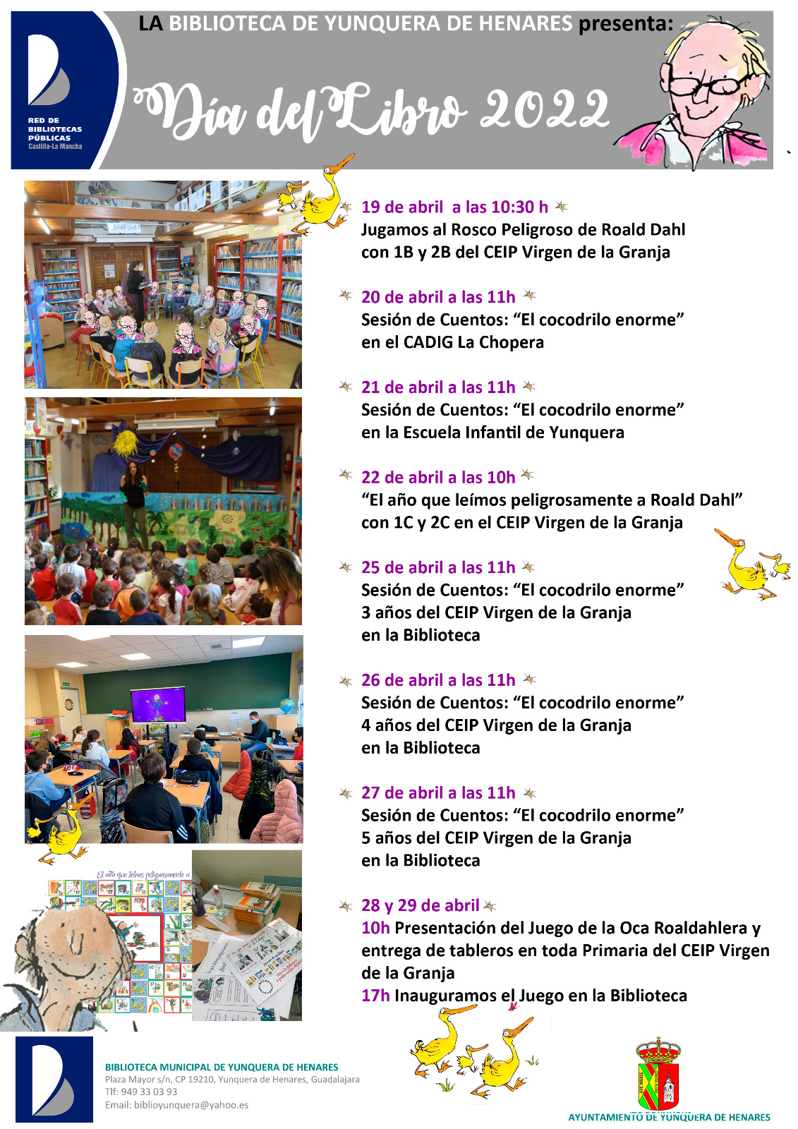 Por su parte, los días 28 y 29 de abril tendrá lugar la presentación del ‘Juego de la Oca Roaldahlera’, en la que se entregará los tableros a los cursos de Primaria del Colegio. Además, por la tarde, se inaugurará el juego en la Biblioteca Municipal.
