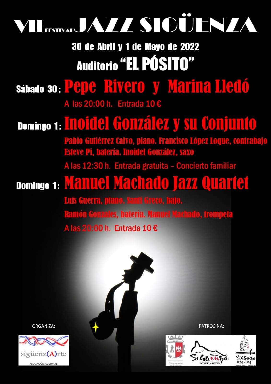 El VII Festival Internacional de Jazz de Sigüenza llega a la ciudad del Doncel con tres conciertos, uno de ellos precisamente en el Día Internacional del Jazz (sábado, 30 de abril) protagonizado por Pepe Rivero y Marina Lledó (Auditorio de El Pósito, 20 horas), y otros dos el domingo, 1 de mayo, Inoidel González y su Conjunto (Auditorio de El Pósito, 12:30 horas) y Manuel Machado Jazz Quartet (Auditorio de El Pósito, 20 horas).