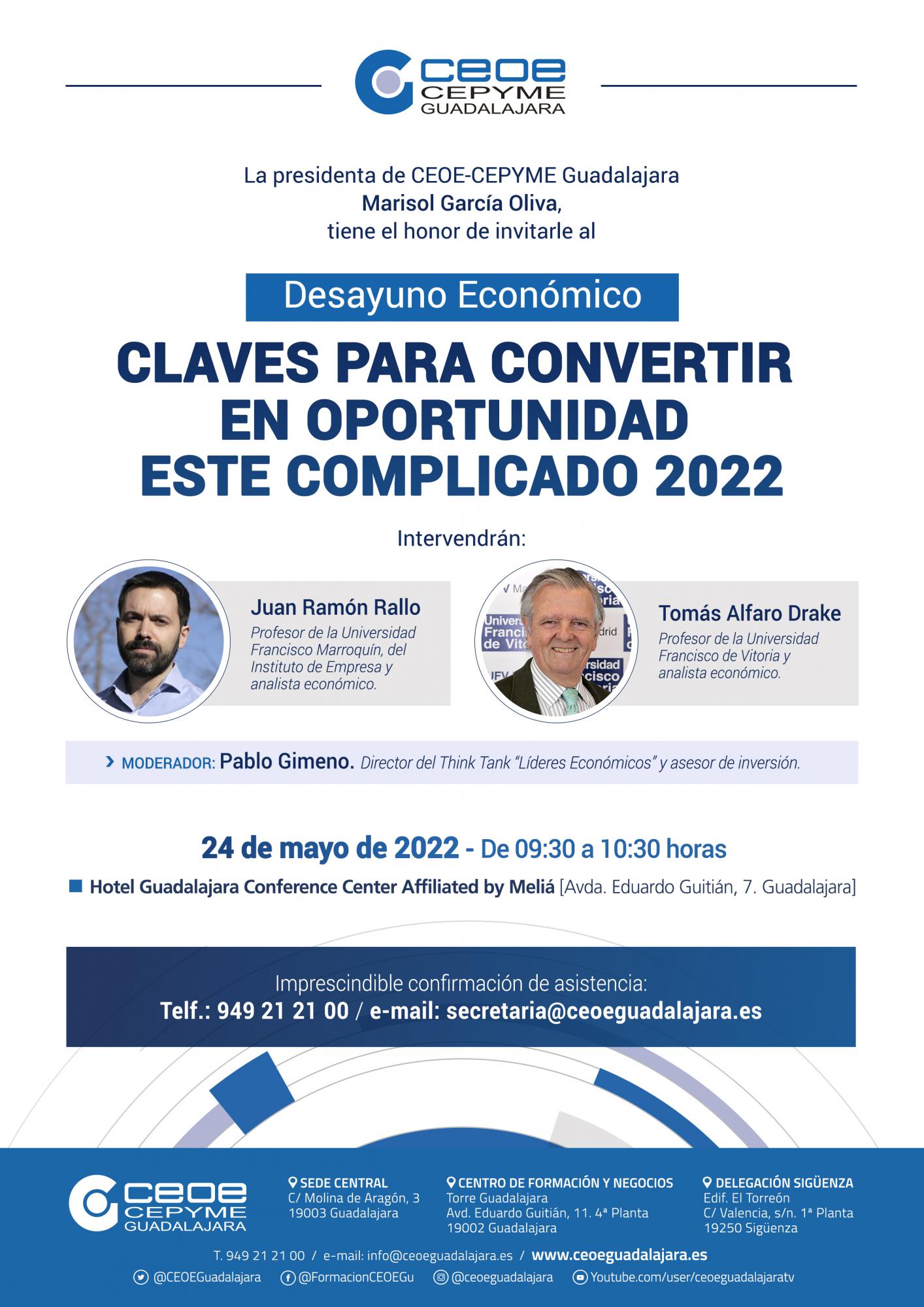 El próximo martes 24 de mayo, CEOE-CEPYME Guadalajara retoma sus desayunos económicos con una sesión titulada “Claves para convertir en oportunidad este complicado 2022” y que contará con la presencia de Juan Ramón Rallo, profesor de la Universidad Francisco Marroquín, del Instituto de empresa y analista económico y con Tomás Alfaro Drake, profesor de la Universidad Francisco de Vitoria y analista económico.