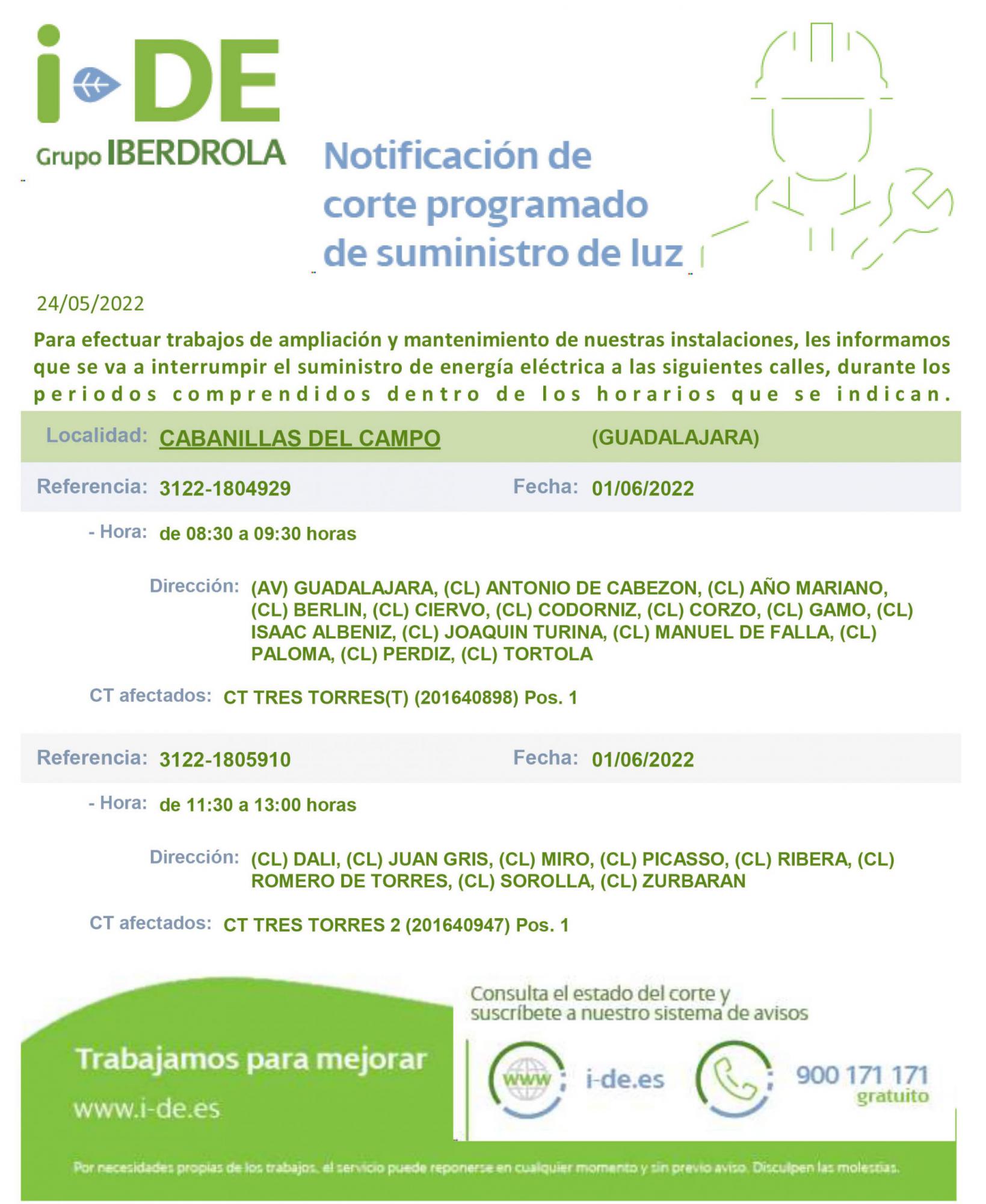 La compañía Iberdrola ha comunicado que va a ejecutar dos cortes programados de electricidad el próximo miércoles 1 de junio en Cabanillas del Campo, debido a la necesidad de efectuar trabajos de ampliación y mantenimiento en sus instalaciones. Afectará a un total de 21 calles de la zona centro.