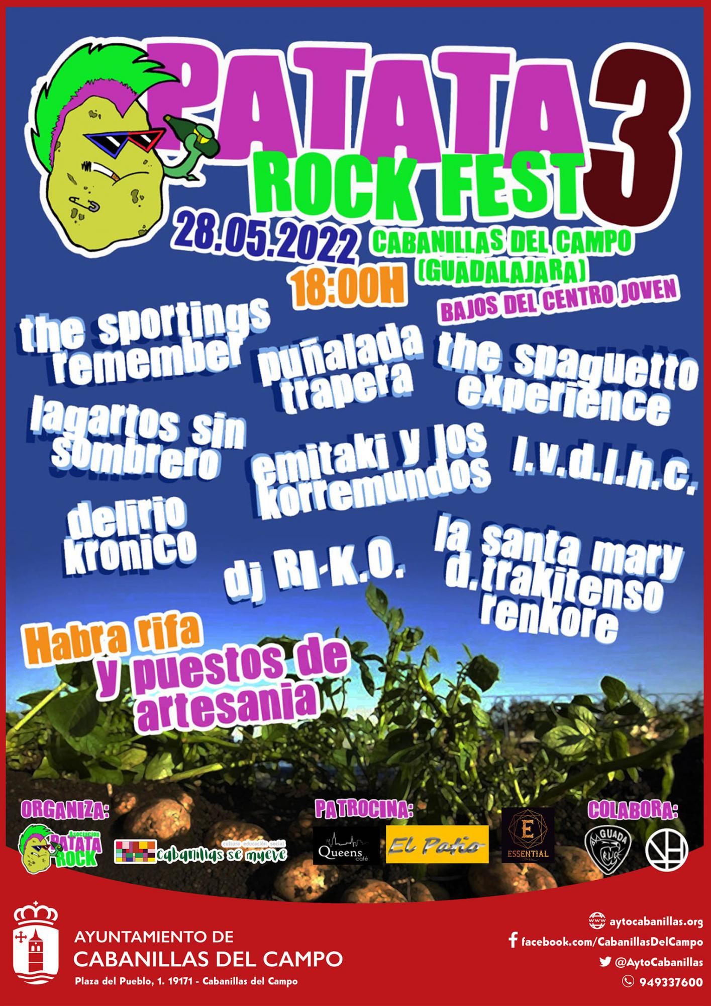 Tercera edición del festival de rock de grupos locales que organiza la Asociación Patata Rock. Con actuaciones en directo y sesiones de DJ. El sábado 28 de mayo, en los bajos del Centro Joven, desde las 18 horas. El festival se complementa con rifas y venta de artesanía.