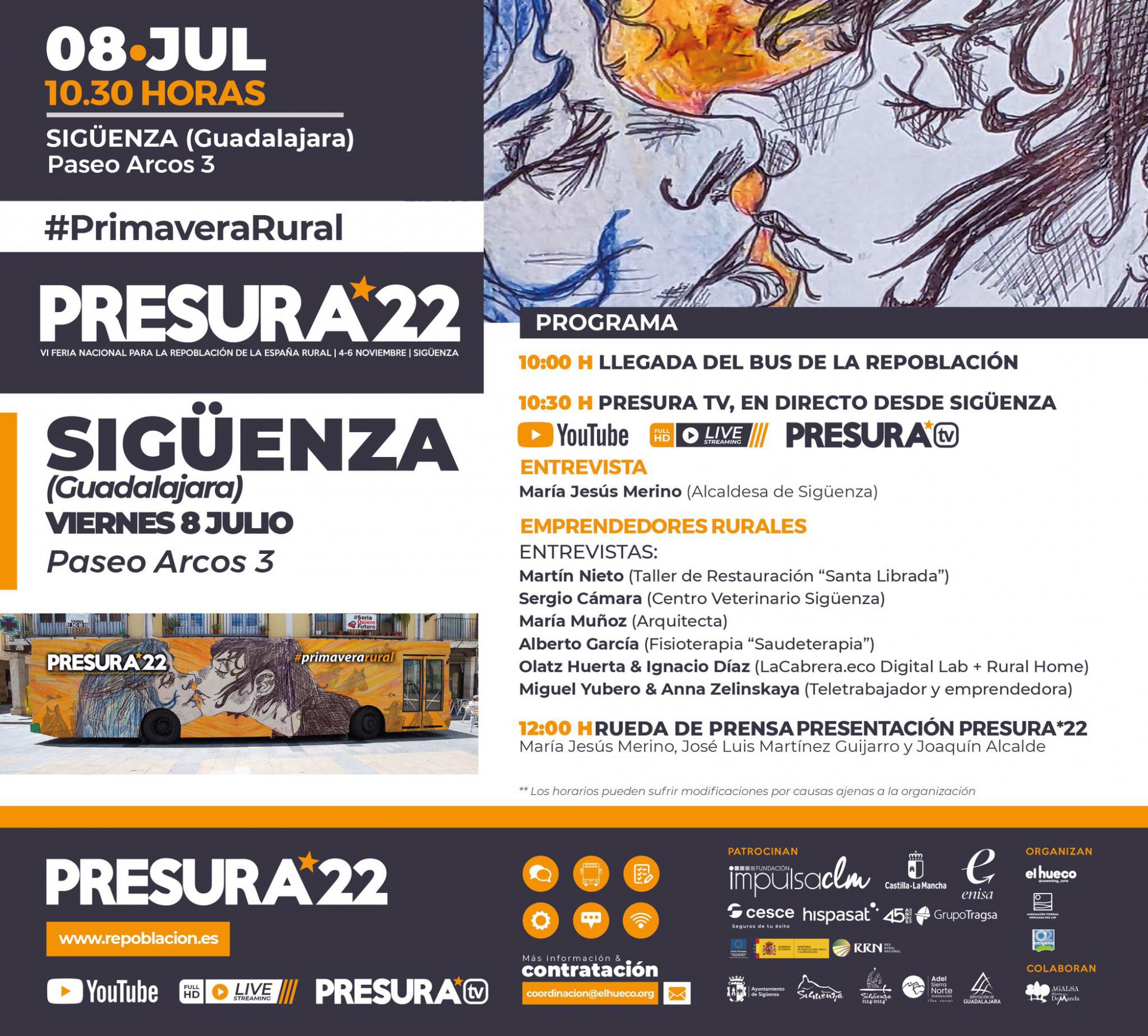Mañana, en Sigüenza se presentará oficialmente la feria Presura, que se celebrará en noviembre en el municipio, y jóvenes emprendedores contarán su proyecto vital en el municipio, en un programa que podrá seguirse en directo a través de Presura TV, a partir de las 11 horas, en esta URL: https://www.youtube.com/watch?v=L-gRWnZ3Sts