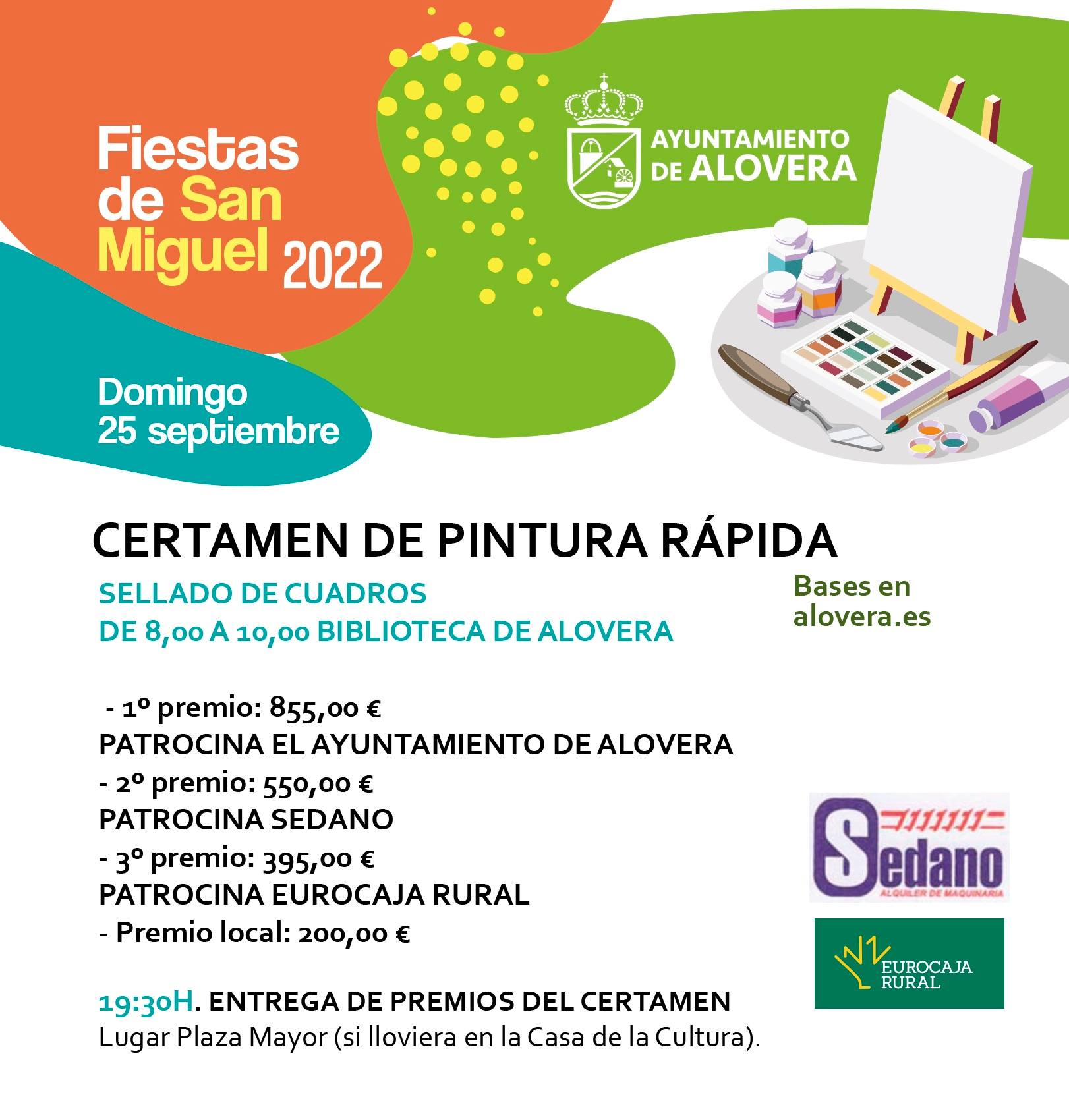 Este XXIV Certamen de Pintura Rápida al aire libre, como viene ocurriendo los últimos años, establece dos accésit distintos para los participantes de acuerdo a sí concurren por la vía local o por la general. La primera contará con un único premio de 200 euros, mientras que la segunda permite optar a tres galardones de mayor cuantía distribuidos con 855 euros para el primer clasificado patrocinado por el AYUNTAMIENTO DE ALOVERA, 550 para el segundo y que ha sido patrocinado por la empresa SEDANO, 395 euros, en el caso del tercero patrocinado por la entidad EUROCAJA RURAL. Las bases están disponibles en www.alovera.es