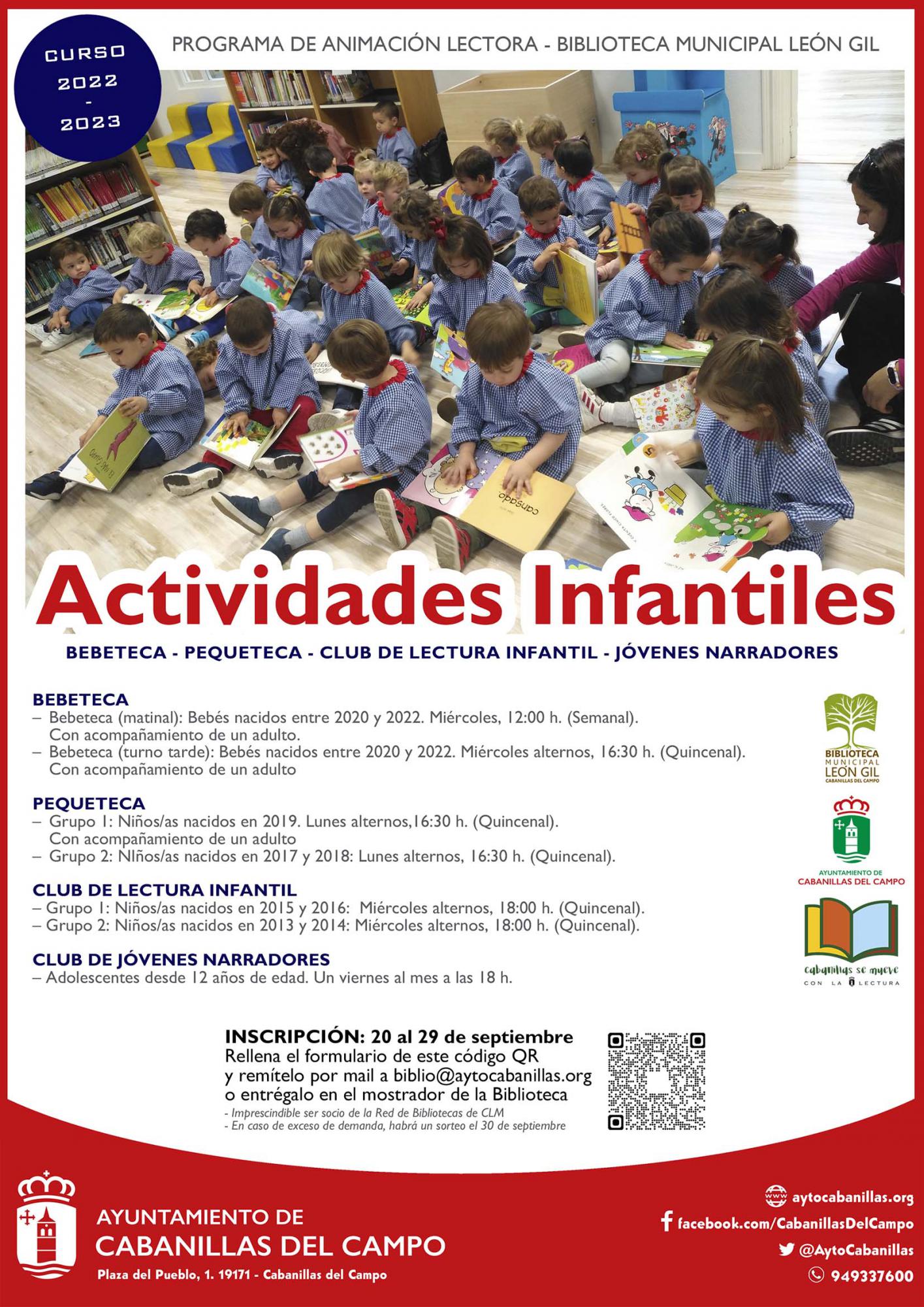 El plazo de inscripción para estas actividades infantiles es desde el martes 20 hasta el jueves 29 de septiembre, y las personas interesadas deben entregar en el mostrador de la Biblioteca el formulario de solicitud cumplimentado, y firmado por un adulto responsable. Este formulario puede solicitarse en el propio mostrador, o descargarse en PDF desde este enlace. Además de en el mostrador, también puede remitirse por correo electrónico a la dirección mail biblio@aytocabanillas.org