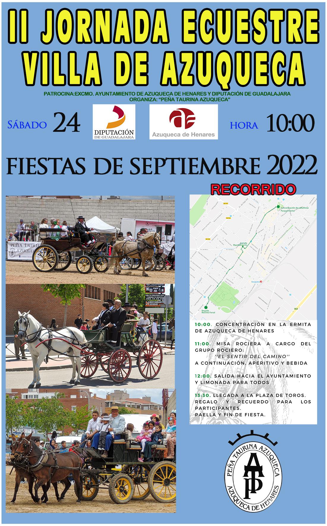 Azuqueca llega a su último fin de semana de fiestas con un intenso programa que se cerrará el domingo con los fuegos artificiales. Entre las actividades del sábado está la II Jornada Ecuestre ‘Villa de Azuqueca’, organizada por la Peña Taurina de Azuqueca y patrocinada por el Ayuntamiento de Azuqueca y la Diputación de Guadalajara. La concentración y salida de los participantes se ha previsto a las 10 de la mañana, desde el parque de La Ermita. A las 11 horas, habrá una Misa Rociera con el coro ‘El sentir del camino’ en el parque de La Ermita y un aperitivo. A continuación, los caballistas iniciarán un recorrido por la carretera de Alovera, la avenida de Francisco Vives, harán parada en la plaza de La Constitución (donde la Casa de Andalucía ofrecerá rebujito a los participantes) y continuarán por la avenida de Alcalá hasta el Recinto Ferial.