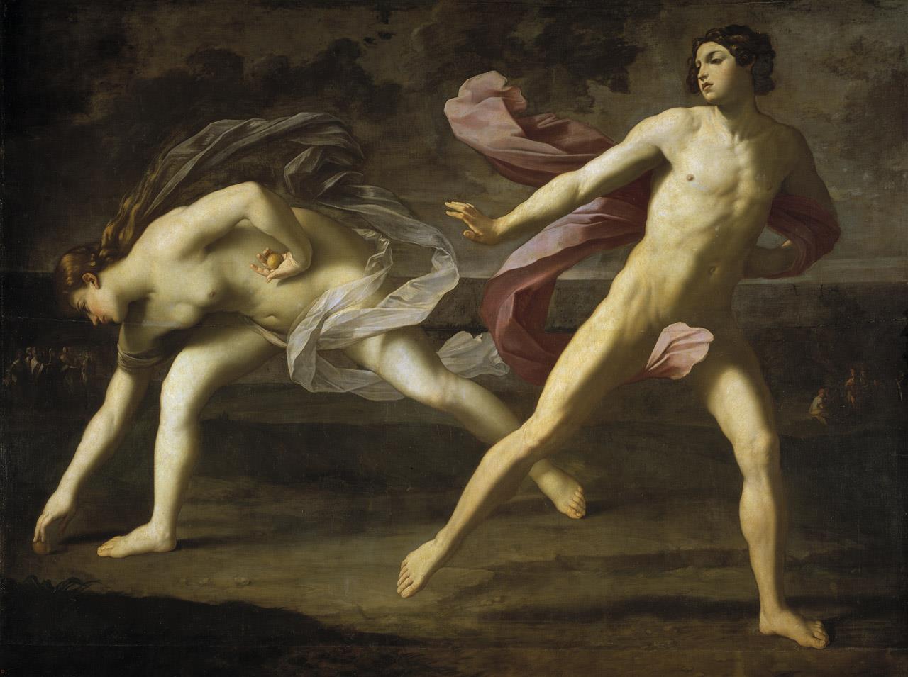 Hipómenes gana con la ayuda de Venus, que le proporciona varias manzanas para que se las fuera tirando a su oponente en la carrera. Guido Reni (1575-1642) plasma justo ese momento, y consigue recoger con delicadeza el esfuerzo de los cuerpos de ambos.
