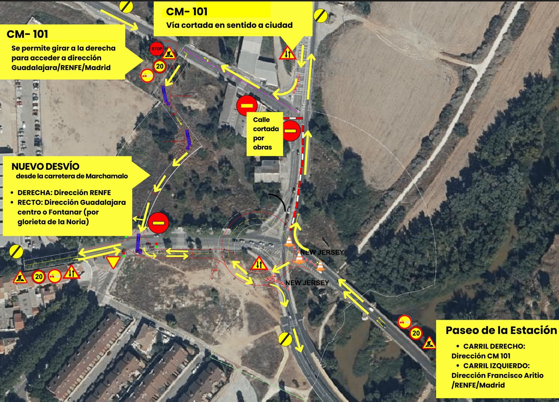 - La carretera de Marchamalo queda cerrada al tráfico y con ello el actual desvío provisional se anula. Los vehículos que accedan a la ciudad por la carretera de Fontanar CM-101 lo harán directamente a través del trazado de la nueva rotonda. Los vehículos que quieran acceder a Guadalajara desde la carretera de