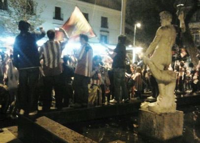 La fuente de Neptuno en la Plaza del Jardinillo se convirtió en un hervidero de aficionados rojiblancos celebrando su victoria