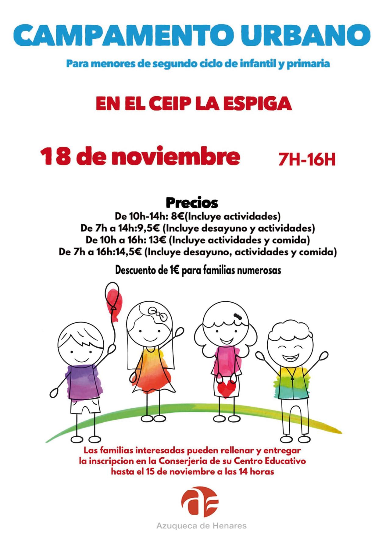 El Ayuntamiento de Azuqueca de Henares ofrece a las familias de la ciudad un campamento urbano el viernes 18 de noviembre, jornada no lectiva en Castilla-La Mancha con motivo de la celebración del ‘Día de la Enseñanza’, según el calendario escolar aprobado por la Junta de Comunidades.