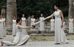 Como manda la tradición, en Olimpia, antigua casa de los Juegos, la Suma Sacerdotisa, bajo la atenta mirada de Lord Sebastian Coe, presidente de Londres 2012, y Jacques Rogge, máximo mandatario del Comité Olímpico Internacional, usó un espejo parabólico para captar los rayos de sol que encendieron el símbolo olímpico, que fue trasladado al antiguo Estadio Olímpico.