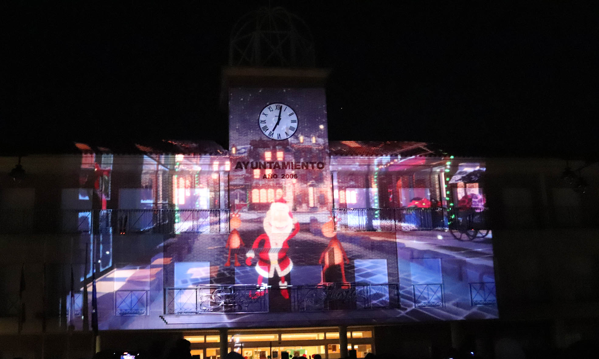 Tras el espectáculo de danza se ha proyectado un «videomapping» sobre la fachada consistorial, un audiovisual especialmente dirigido a niños y niñas, quienes en gran cantidad se congregaban en la plaza. En él se contaba la historia de un Papa Noel que pedía ayuda a los peques para poner en marcha a sus desanimados renos. La proyección del cuento audiovisual ha terminado con una cuenta atrás, muy coreada por la gente menuda, tras la que se ha producido el espectacular encendido de todas las luces de colores que llenan ya las calles de la localidad. Confetti y un pequeño castillo de fuegos artificiales, con la «imprescindible» Mariah Carey como música de fondo, llenaban entonces de luz, sonido y color la Plaza del Pueblo durante unos minutos.