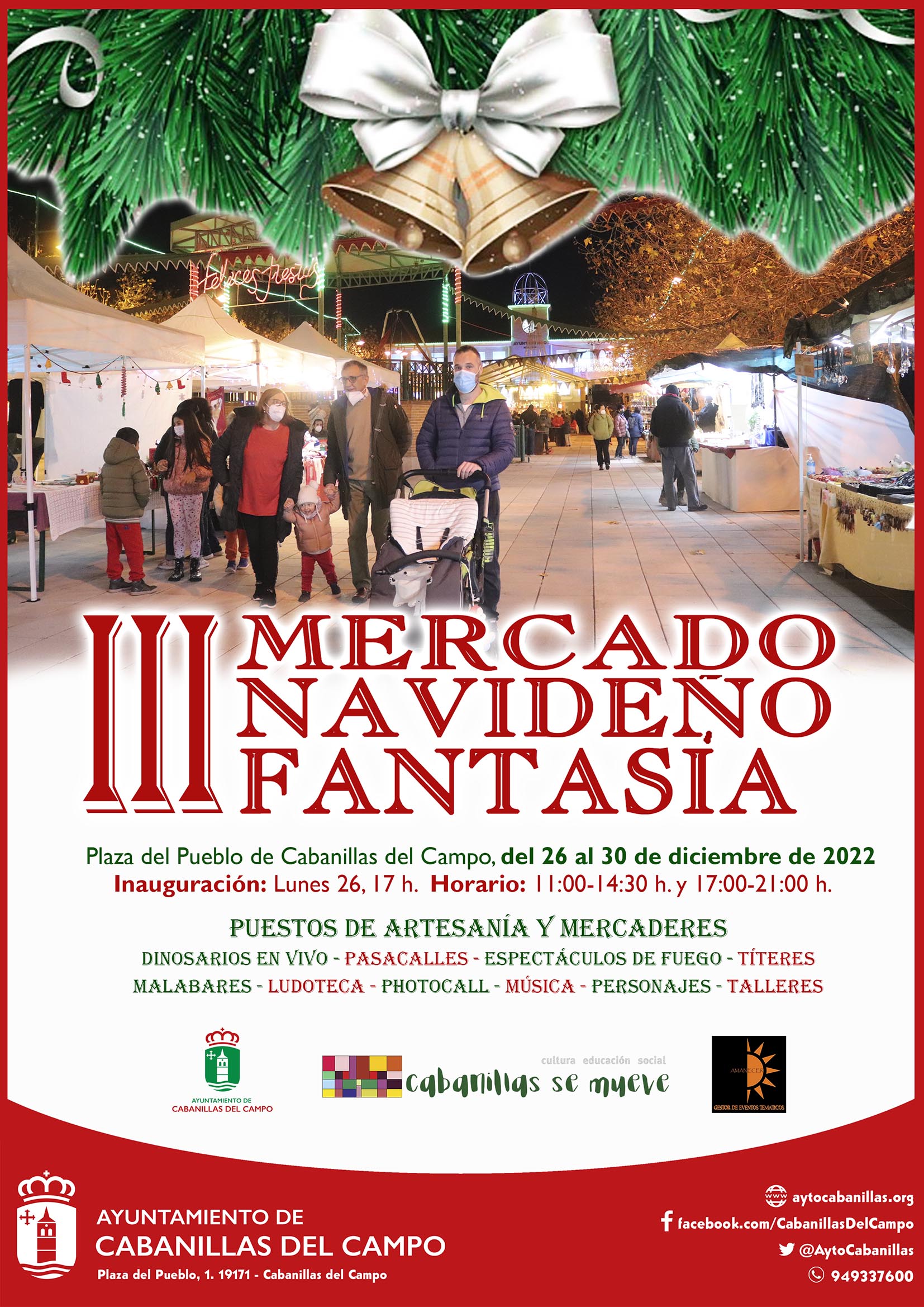 Del 26 al 30 de diciembre Cabanillas acogerá la celebración del «III Mercado Navideño de Fantasía», una propuesta del programa municipal de actos de esta Navidad, que reúne durante cinco días a decenas de puestos de mercancías y de artesanía en la Plaza del Pueblo, al tiempo que la compraventa de productos se acompaña de multitud de actividades de animación, destinadas a toda la familia.