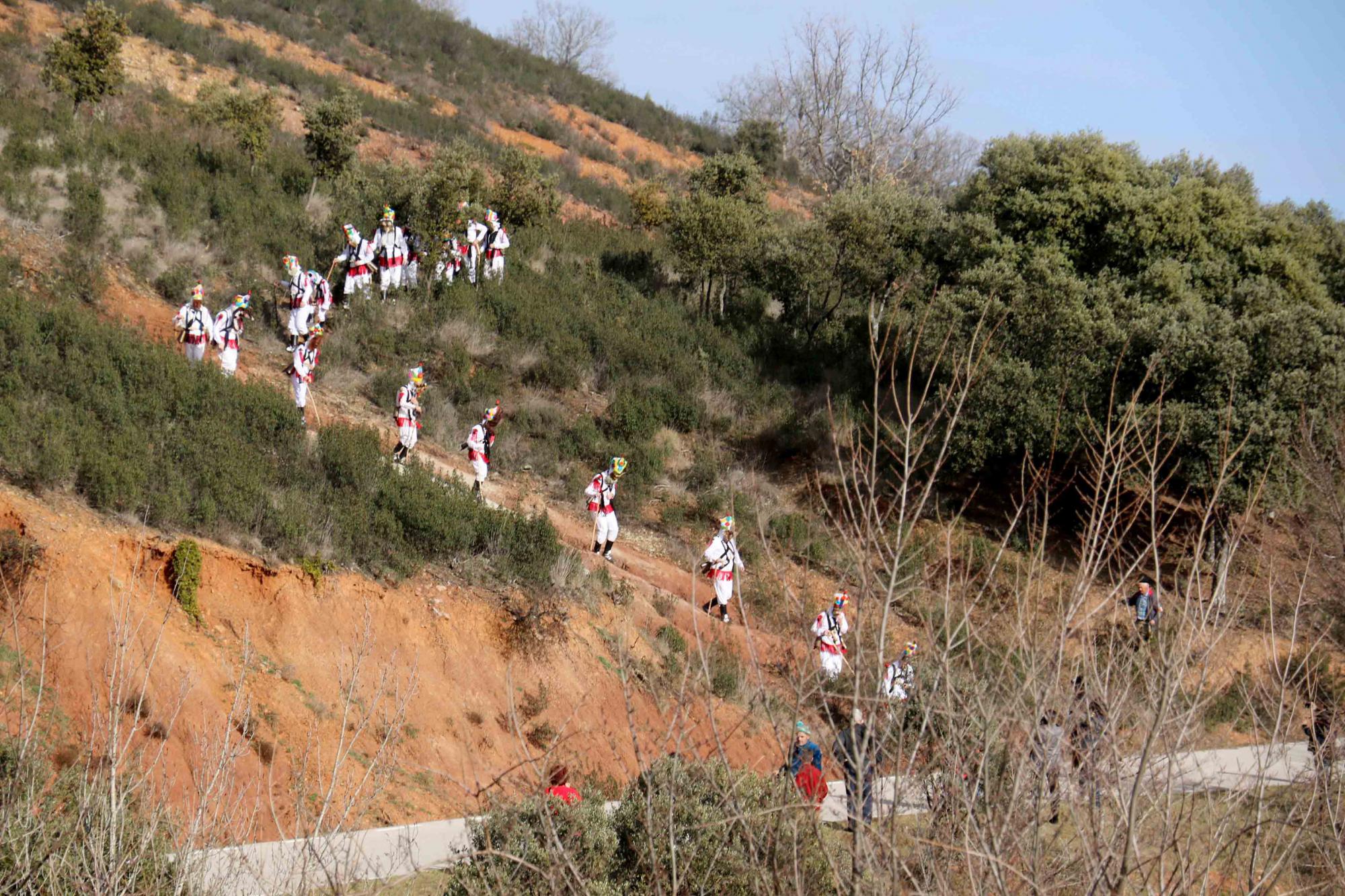 Precisamente por 'La Puentecilla', y más concretamente en su fuente redonda de la que sale un agua clara y fresca que dicen es estupenda para el riñón, empezaron las cuatro vueltas que le dan al pueblo, haciendo sonar, todos a un tiempo, sus cencerros. El paso que llevan tiene algo de militar, puesto que no es nada fácil conseguir que suenen los cencerros, y mucho menos, que lo hagan a la vez. El recorrido por las calles de Almiruete es el mismo, en sentido contrario a las agujas del reloj, tal y como llegan las borrascas al Ocejón para fertilizar sus faldas. “A ver si vuelve alguna, que lleva tiempo sin llover”, pedían los botargas veteranos, en nombre de la tierra que empieza a estar reseca.