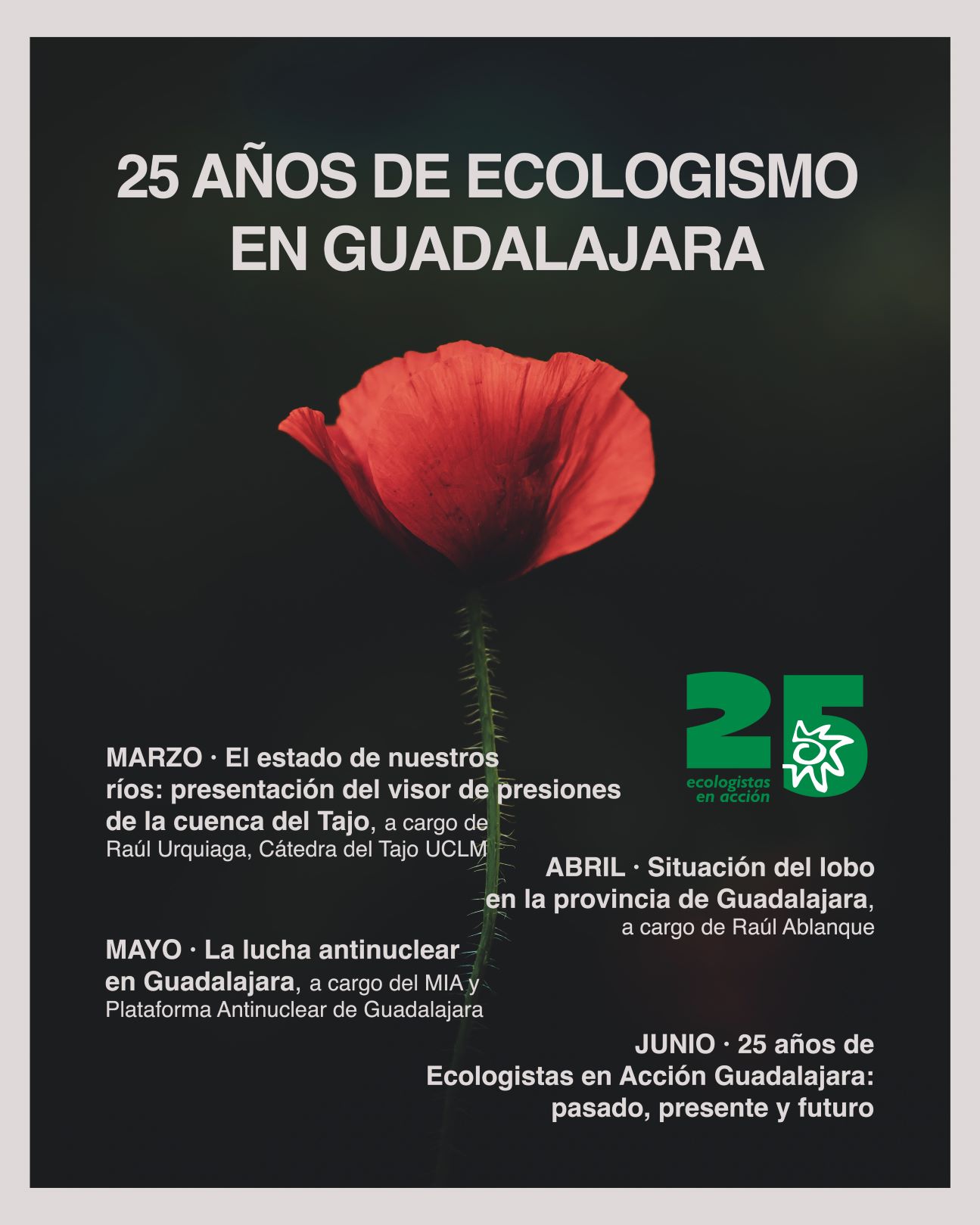 Ecologistas en Acción celebra este año su XXV Aniversario bajo el lema “25 años de ecologismo en Guadalajara” con un ciclo de conferencias que se inician el viernes, 3 de marzo a las siete de la tarde, con el tema “El estado de nuestros ríos: presentación del visor de presiones de la cuenca del Tajo” en la biblioteca Dávalos.