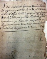 La exposición recoge una selección de documentos pertenecientes todos al emblemático año de 1812. Junto a los acontecimientos políticos que marcan los primeros meses del año con la presencia del obispo Vejarano en las Cortes de Cádiz, la promulgación de la Pepa el 19 de marzo, la convocatoria de elecciones a ayuntamientos constitucionales y el juramento de la Constitución por esa nueva corporación el 3 de octubre, todo ello reflejado en documentos municipales seguntinos, podemos encontrar otros no menos interesantes que ayudan al investigador a reconstruir la vida local: un vecindario donde aparecen distribuidos por las calles de la ciudad todos los habitantes cabeza de familia junto con el oficio que desempeñaban; libros de cuentas municipales, donde se recogen los remates o subastas de productos de primera necesidad como carnes y menudos, aceites y aguardientes para su posterior comercialización; libros que recogen los suministros de alimentos y bebida que estaban obligados a entregar a las tropas francesas y los libros de cuentas de la las cinco tabernas que había en la ciudad, donde vendían el vino.
