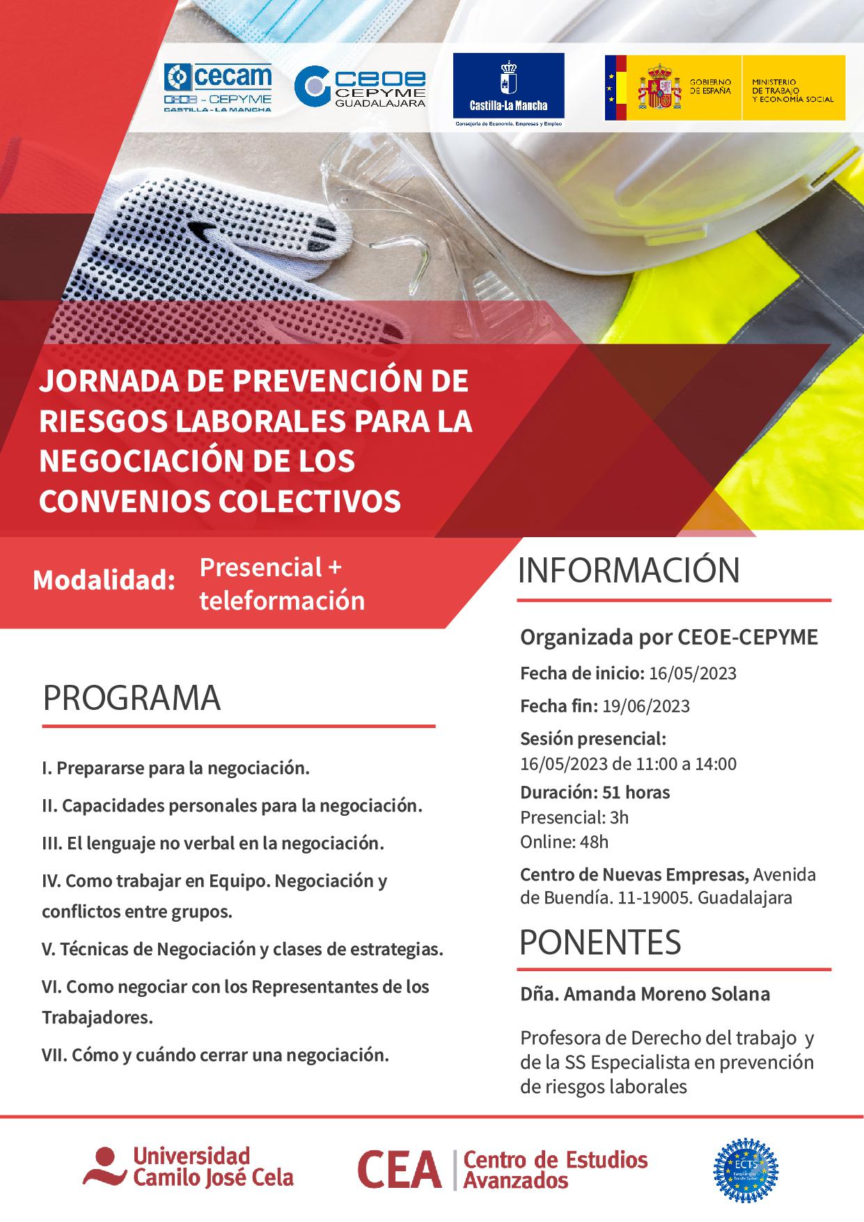 En esta ocasión, la jornada titulada “Prevención de riesgos laborales para la negociación de los convenios colectivos” con una sesión presencial el martes 16 de mayo de 11:00 a 14:00 en el centro de nuevas empresas de Guadalajara y el resto del curso en la modalidad de teleformación, con una duración de 48 horas que se desarrollará hasta el 19 de junio.