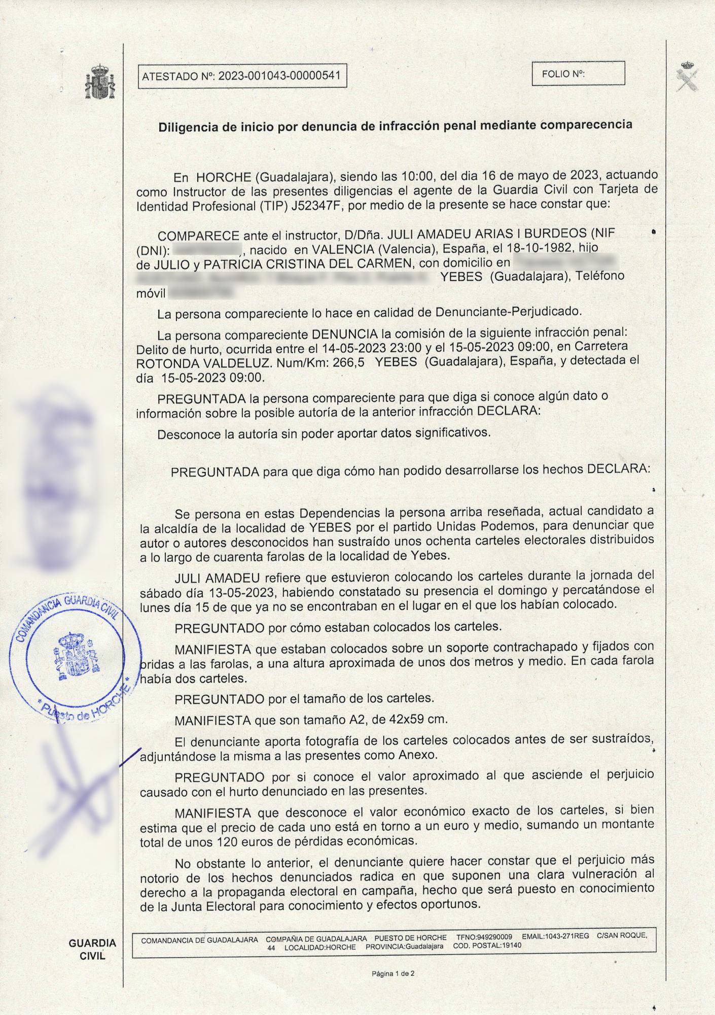La formación morada ha solicitado a la Benemérita el visionado de las cámaras de seguridad en busca de responsables y ha informado a la Junta Electoral. Juli Amadeu Àrias, candidato de Unidas Podemos a la alcaldía de Yebes, considera que se trata de “un acto antidemocrático, realizado con premeditación y con medios, al tenerse que subir a más de 40 farolas con escaleras para quitarlos”.
