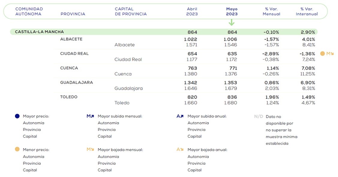 En cuanto a las capitales manchegas, Guadalajara (2,03%) arrojó el undécimo repunte mensual más señalado del cómputo nacional. Albacete (-1,57%) fue la cuarta capital española que más bajó. Frente a mayo de 2022, todas las capitales de Castilla-La Mancha subieron. Cuenca (11,25%) fue la octava en el ranking nacional de ascensos. En cuestión de precios, Toledo (1.680 ?/m²) fue la capital más cara de Castilla-La Mancha y Ciudad Real (1.172 ?/m²) la más barata, siendo la segunda más asequible de España.