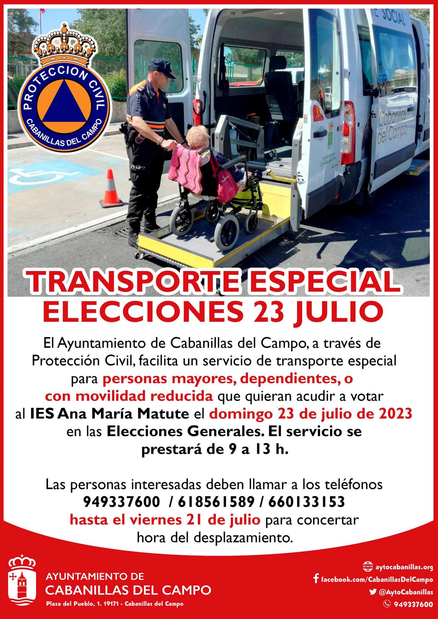 Como es habitual en cada convocatoria electoral, el Ayuntamiento de Cabanillas del Campo pone en marcha un sistema de transporte especial, destinado a acercar al Colegio Electoral de la localidad a aquellas personas con problemas de movilidad que quieran acudir a votar el próximo domingo 23 de julio, en las Elecciones Generales convocadas para esta jornada.