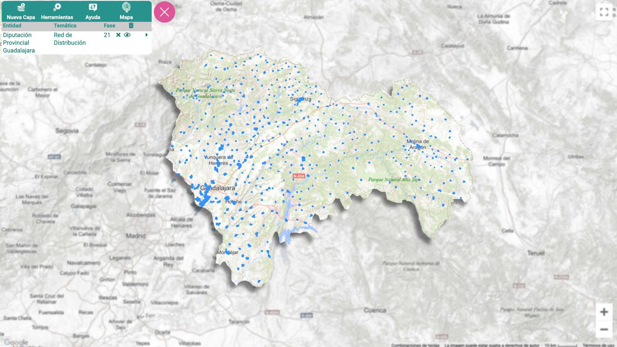 La Diputación de Guadalajara cuenta ya con un pormenorizado estudio cartográfico de servicios en los pueblos de la provincia, al que se puede acceder a través de la página web de la Diputación (www.dguadalajara.es). La herramienta, a la que se accede a través del enlace https://eiel.redsara.es/visor/19, permite ampliar la imagen y admite la consulta individualizada de cada municipio y también la consulta global del conjunto de la provincia.