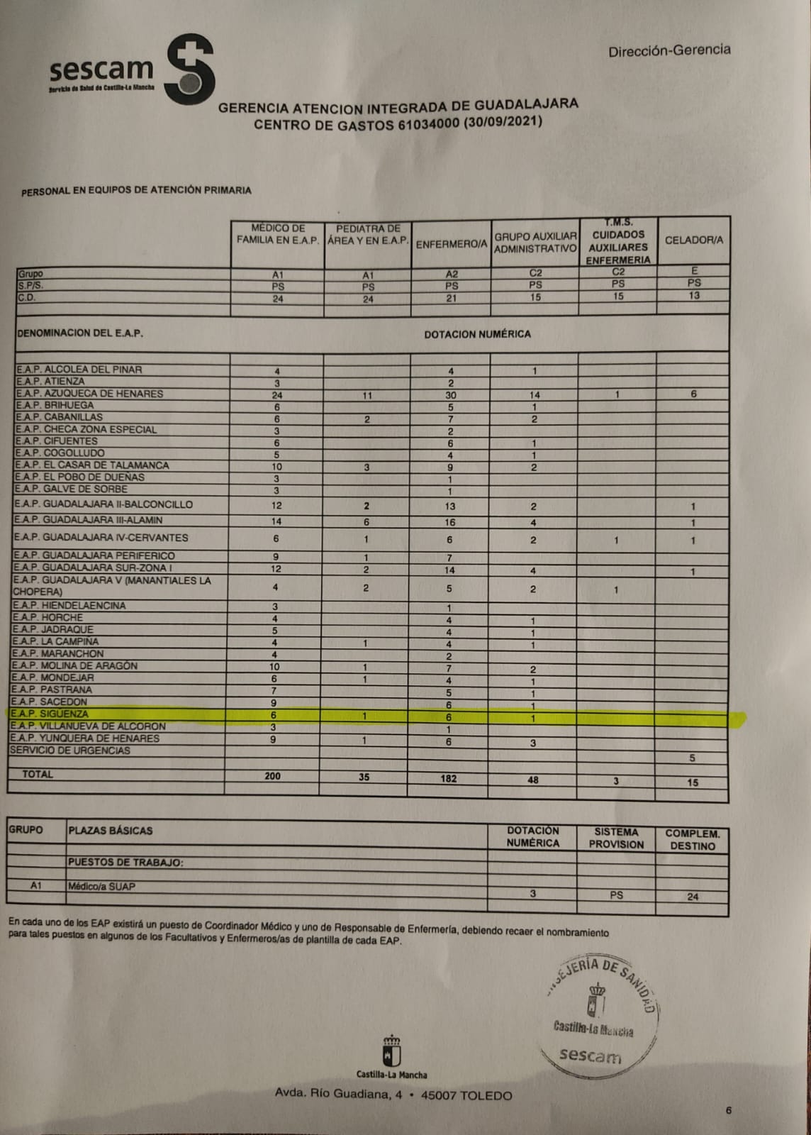 Lamentablemente, la reunión no fue productiva, ya que la Gerencia se enrocó negando que a la zona básica de Sigüenza le correspondan seis médicos y un pediatra; aún presentando la documentación publicada por el SESCAM en la que se acreditan esas cifras ellos siguen asegurando que son cinco.