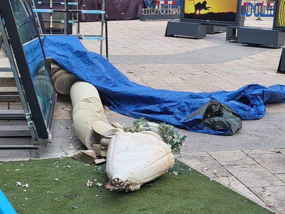 El Ayuntamiento de Albacete informa de que un accidente ha provocado la caída de la estatua de la Virgen situada en lo alto del Triunfo ubicado en la Plaza Virgen de Los Llanos, un monumento en honor a la Patrona de la ciudad que fue instalado en el año 2000.