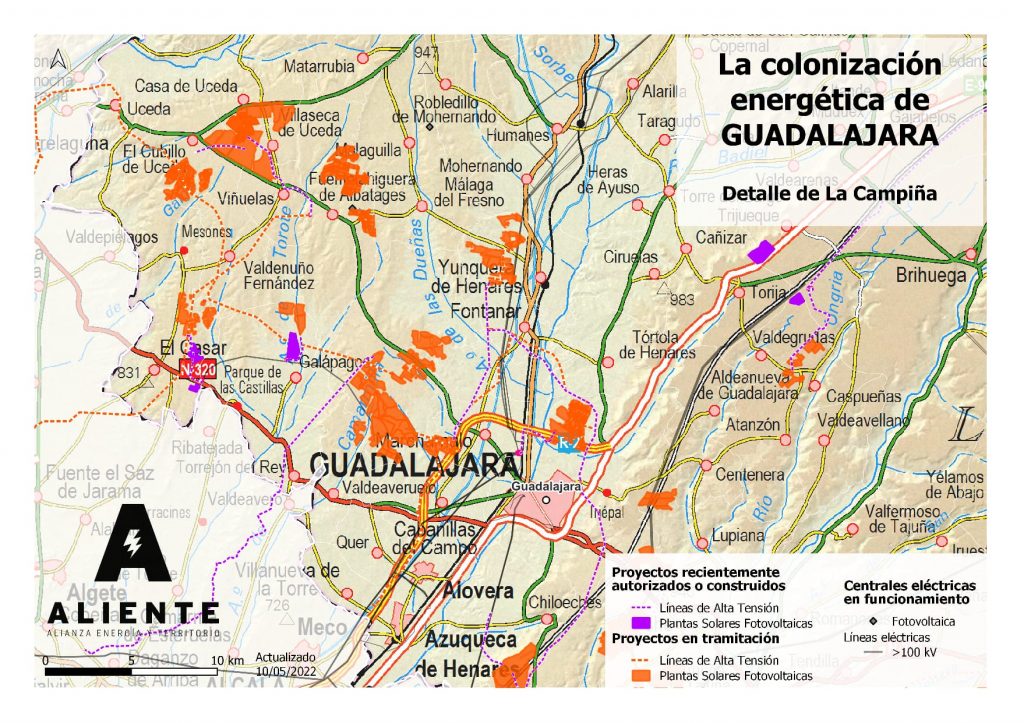 Usted comenta con mucha lógica que hay concentración de proyectos en las zonas “donde están los recursos”; genial, como Guadalajara tiene recursos y está muy próxima a Madrid, la concentración de proyectos energéticos es ya agobiante para los habitantes de muchos pueblos de nuestra provincia. Veremos en un par de años cuando nuestro territorio haya cambiado y en muchas zonas el paisaje se componga de módulos fotovoltaicos, espacios vallados, enormes aerogeneradores e inacabables líneas aéreas de alta tensión. Mucha gente se irá de esos pueblos que ya no serán pueblos sino enormes polígonos industriales.