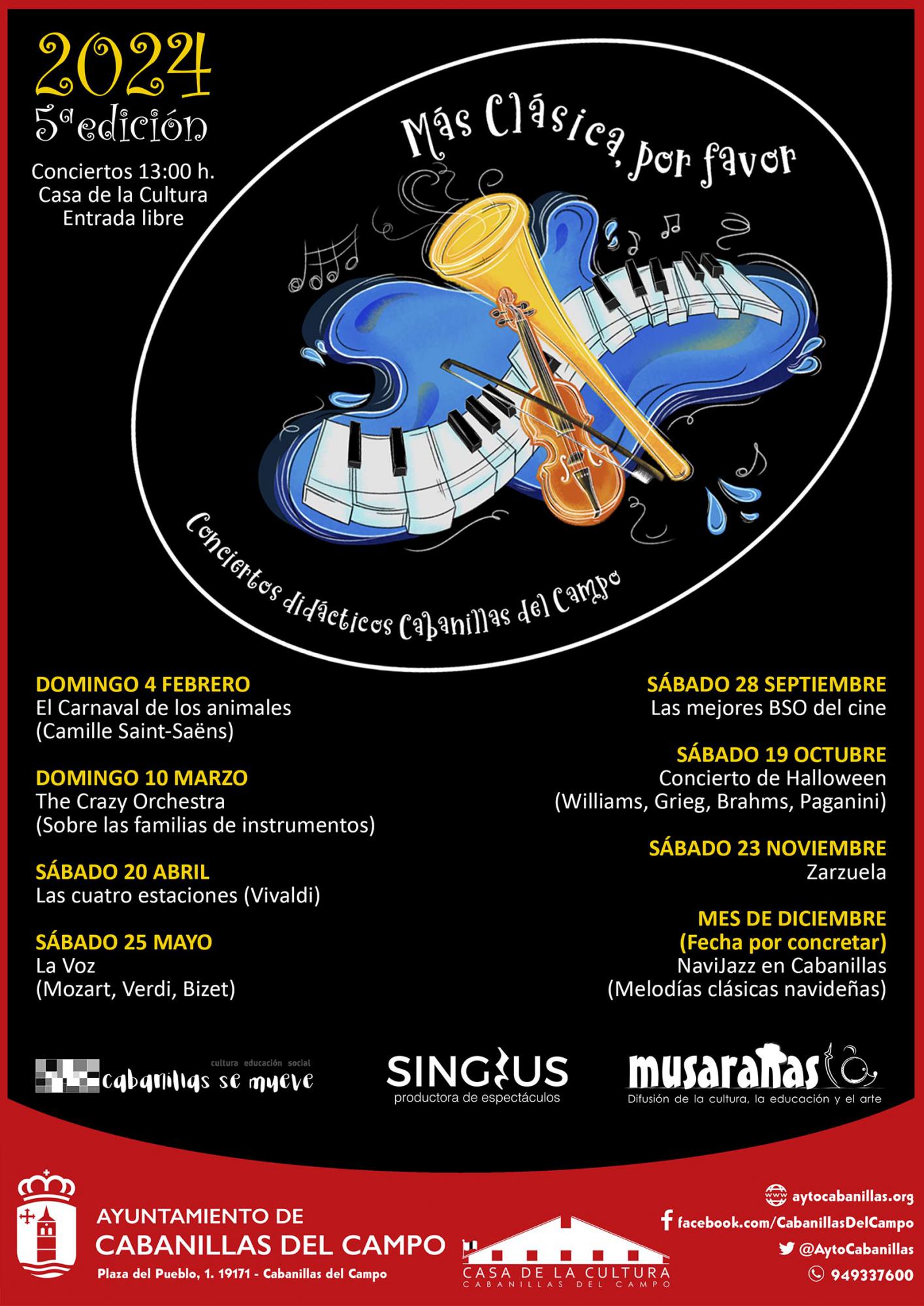 El Ayuntamiento de Cabanillas del Campo reeditará este 2024 el ciclo de actuaciones para público familiar, con conciertos de carácter didáctico, que ha venido desarrollándose a lo largo de los últimos años en la localidad. Este ciclo, que ha cumplido cuatro temporadas bajo el título “Más música, por favor”, experimentará no obstante este año un cambio importante, ya que se ha optado por dedicarlo de modo íntegro a la música clásica o culta, por lo que se desarrollará con la nueva marca “Más Clásica, por favor”.