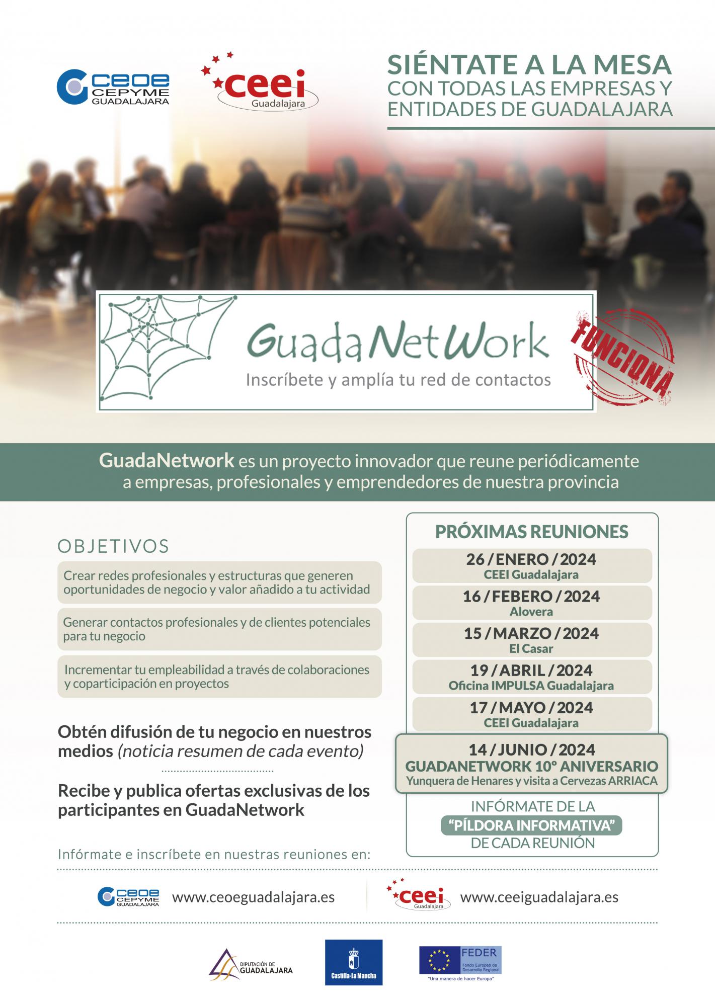GuadaNetWork vuelve un año más con seis nuevos encuentros para este primer semestre del año donde, los empresarios y emprendedores asistentes podrán crear y consolidar sus redes profesionales y nuevas estructuras que les generen oportunidades de negocio, así como un valor añadido a su actividad profesional.