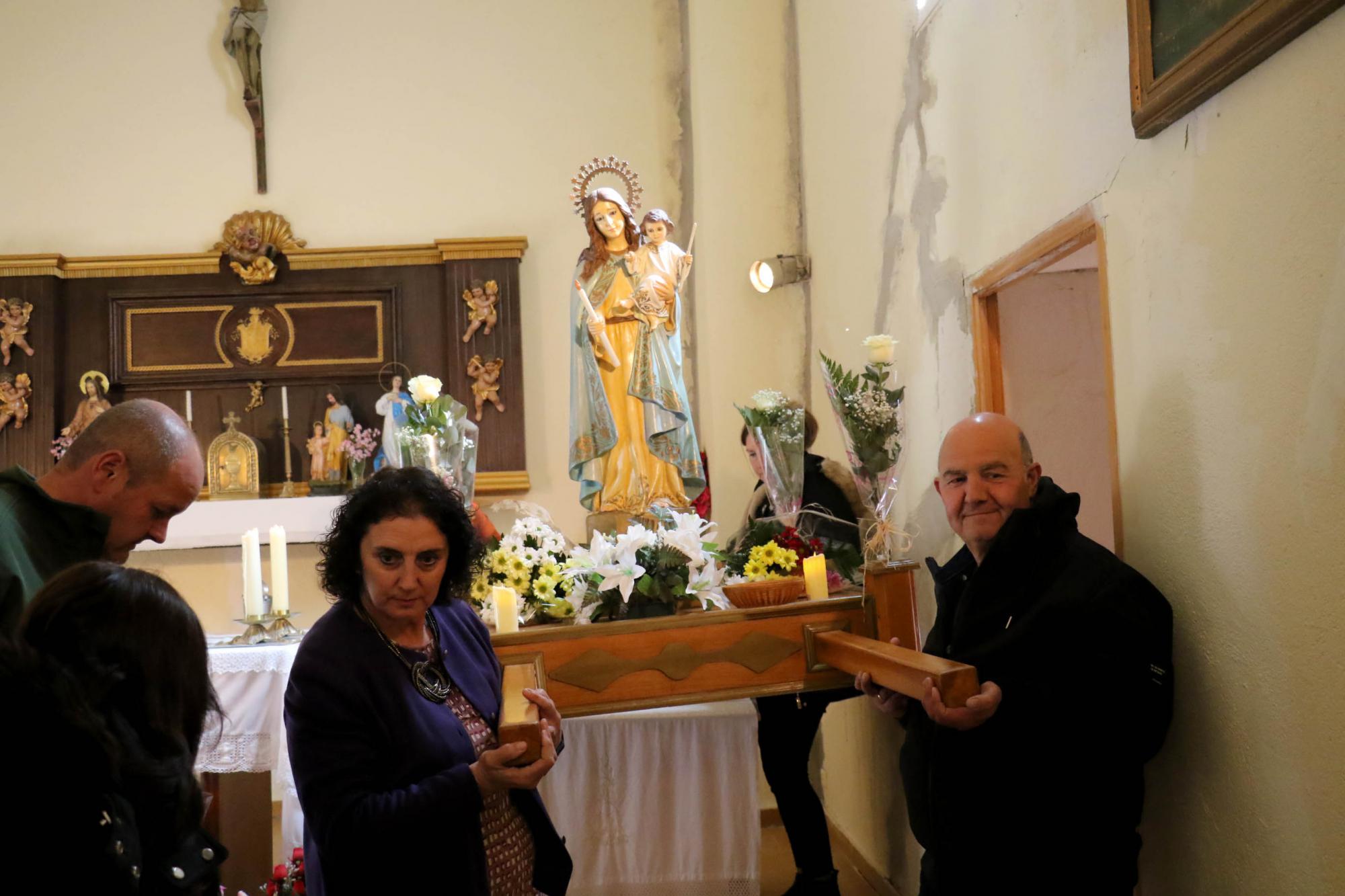 Rematada la subasta, y aclaradas las cuentas, la bella talla en madera, del siglo XVII, era izada a hombros de los lugareños y lugareñas y, precedida por la música de la dulzaina y tamboril, salía en procesión, primero desde la calle de la Fuente y después desde el Camino del Cementerio. Para volver al interior del templo por la calle de la Iglesia.