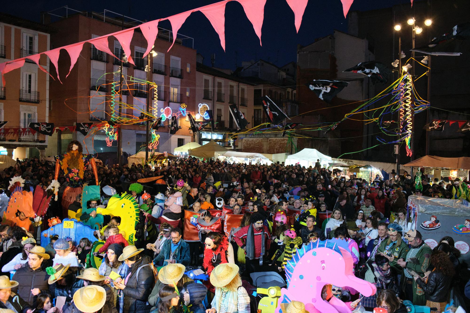 La plaza Mayor se quedó pequeña para acoger tantos disfraces y tanto público, con la novedad de poder disfrutar de los retos que un divertido bingo planteaba a los participantes, mientras el jurado deliberaba, Vermú en el Mercado de Abastos, Mercado Pirata y Cabezudos