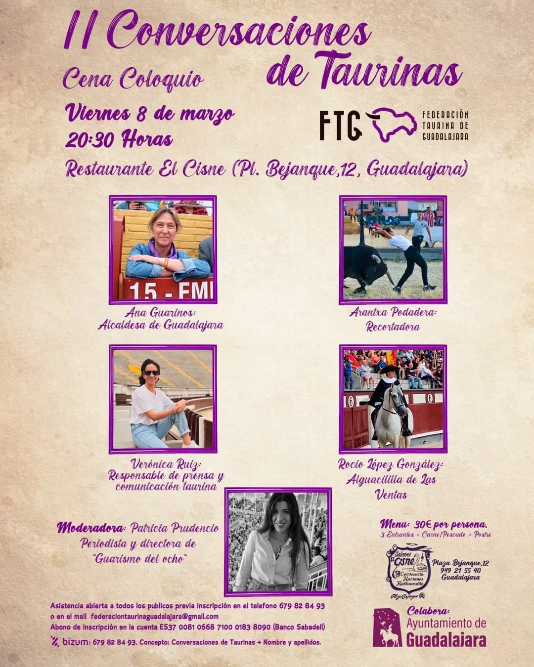 La Federación Taurina de Guadalajara se enorgullece en anunciar la segunda edición de la Cena-Coloquio "Conversaciones de Taurinas", dedicada a rendir homenaje a la mujer en la tauromaquia. El evento se llevará a cabo el día 8 de marzo a las 20:30 horas en el prestigioso restaurante El Cisne de Guadalajara.