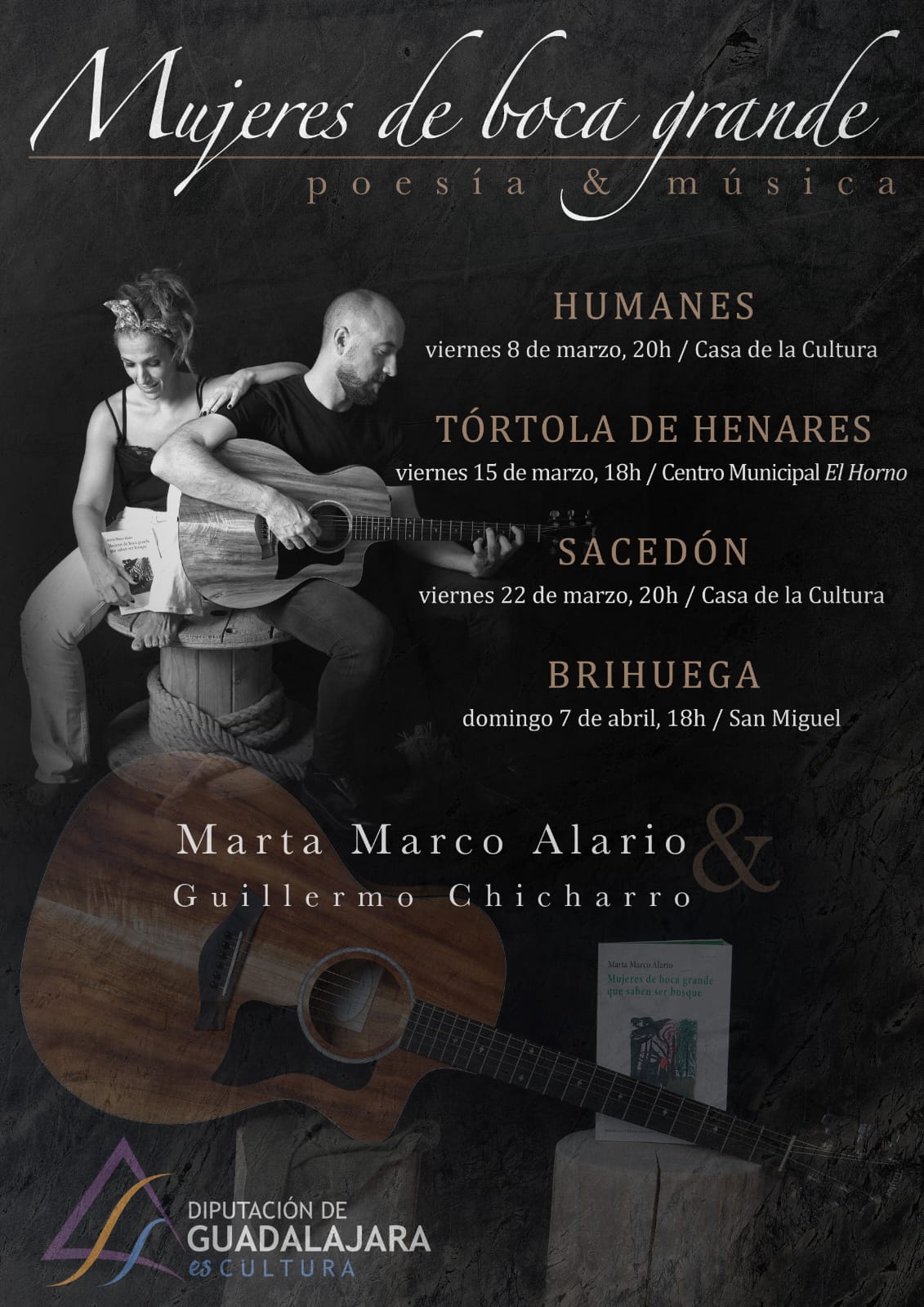 El Servicio de Cultura de la Diputación de Guadalajara llevará el espectáculo de poesía y música ‘Mujeres de boca grande’ a cuatro pueblos de la provincia -Humanes, Tórtola de Henares, Sacedón y Brihuega- como actividad relacionada con la celebración del 8M, Día Internacional de la Mujer.
