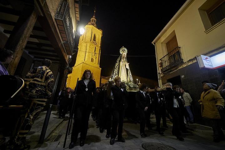 Seguidamente una treintena de mujeres de la hermandad ataviadas con luto y mantilla junto a las hermanas que portaban la imagen de Nuestra Señora de los Dolores salían desde la iglesia de San Pedro y recorrían las principales calles del municipio. El paso de la imagen lo marcaba la Banda de Música de Nuestra Señora de la Soledad.
