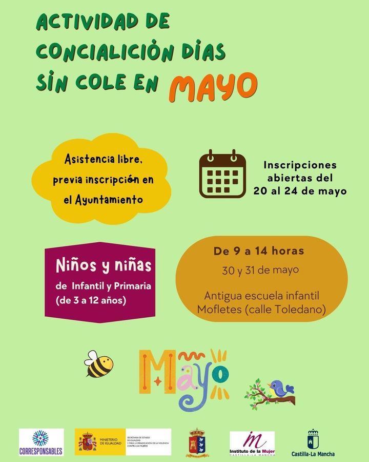 La actividad, de carácter gratuito, se desarrollará en los citados días en la antigua escuela infantil Mofletes (ubicada en la calle Toledano), con horario de 9 a 14 horas. El número de plazas es limitado. Las inscripciones pueden formalizarse en el Ayuntamiento, siendo el plazo del 20 al 24 de mayo.