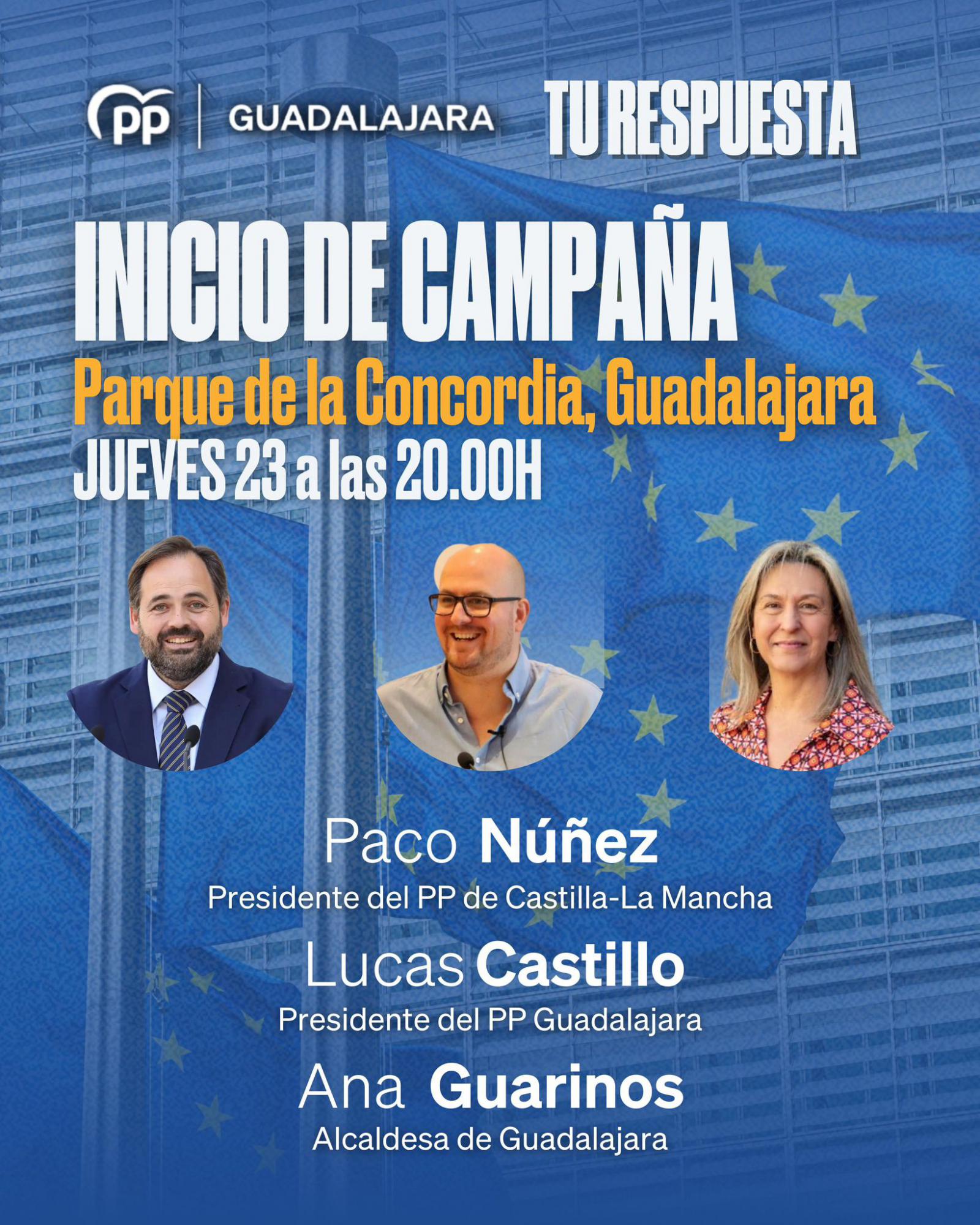 El Partido Popular de Guadalajara inicia este jueves a las 20:00 horas la campaña electoral de cara a las elecciones europeas, bajo el lema ‘Tu respuesta’, que tendrán lugar el próximo 9 de junio. Será en un gran acto con afiliados, simpatizantes, alcaldes y concejales de toda la provincia donde participará el presidente del PP de Castilla-La Mancha, Paco Núñez; el presidente provincial y senador Lucas Castillo, y la alcaldesa de Guadalajara, Ana Guarinos. El acto dará paso a la tradicional pegada de carteles que tendrá lugar a las 00:00 horas.