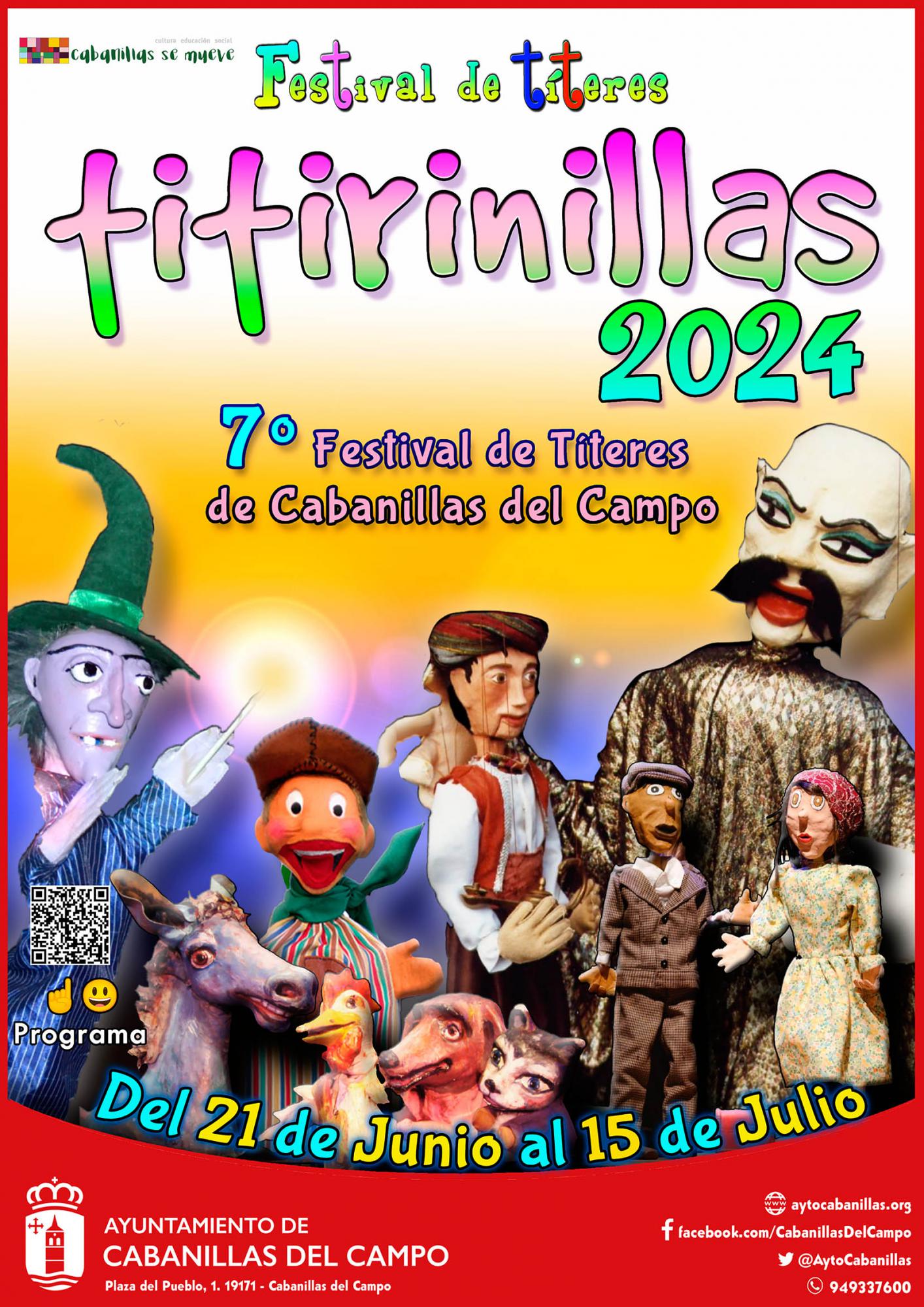 Del 21 de junio al 15 de julio de 2024 Cabanillas del Campo acoge la celebración de la séptima edición de “Titirinillas”, el Festival de Títeres de la localidad, que organiza el Ayuntamiento. En esta ocasión son cinco las obras en cartel, una para público joven y adulto (recomendada desde 12 años), y otras cuatro para público infantil, a desarrollar los días 21 y 24 de junio, y 1, 8 y 15 de julio.
