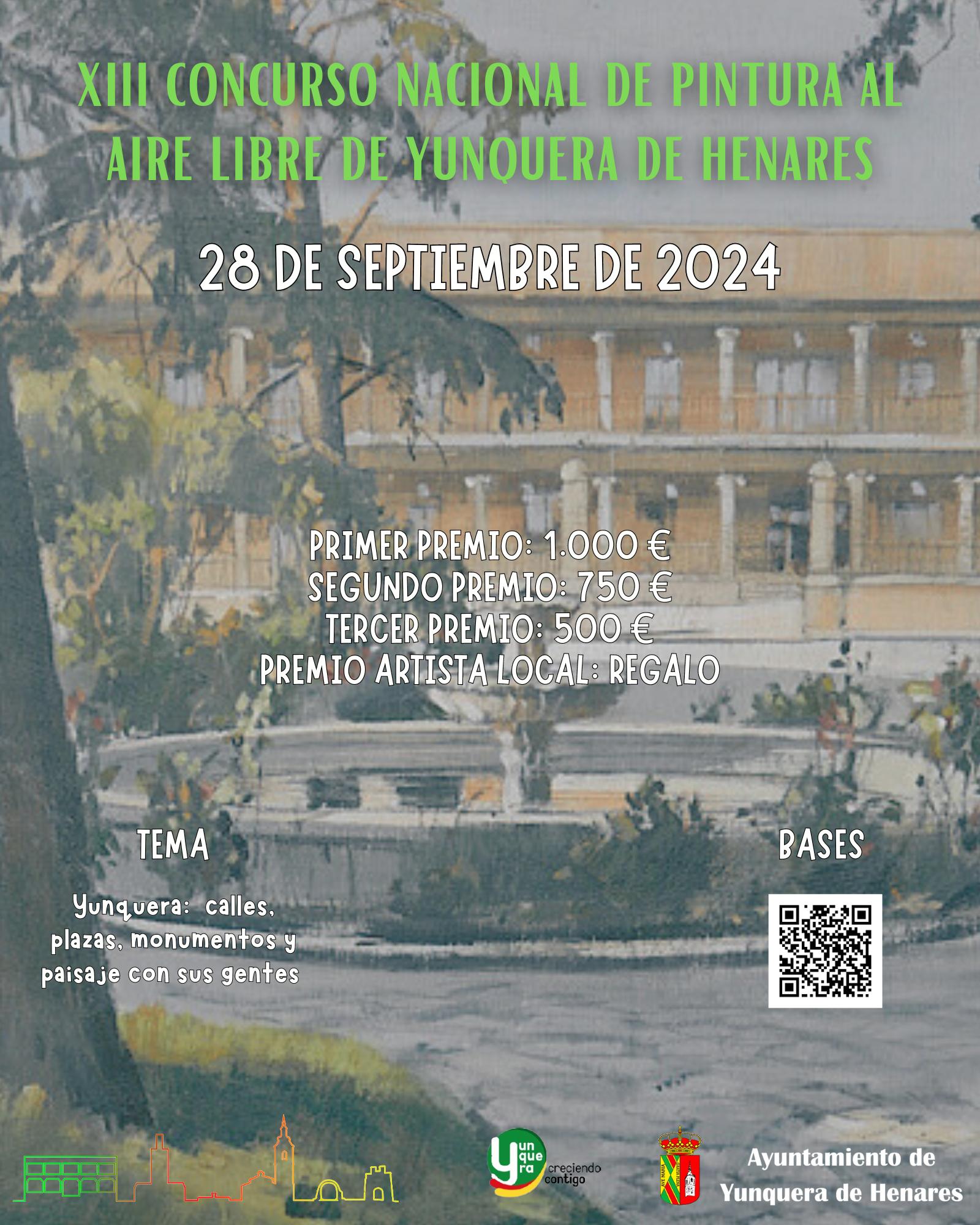 La Concejalía de Cultura del Ayuntamiento de Yunquera de Henares ha convocado el XIII Concurso Nacional de Pintura al Aire Libre para el próximo 28 de septiembre. El tema único será de nuevo “Yunquera: calles, plazas, monumentos y paisaje con sus gentes”.