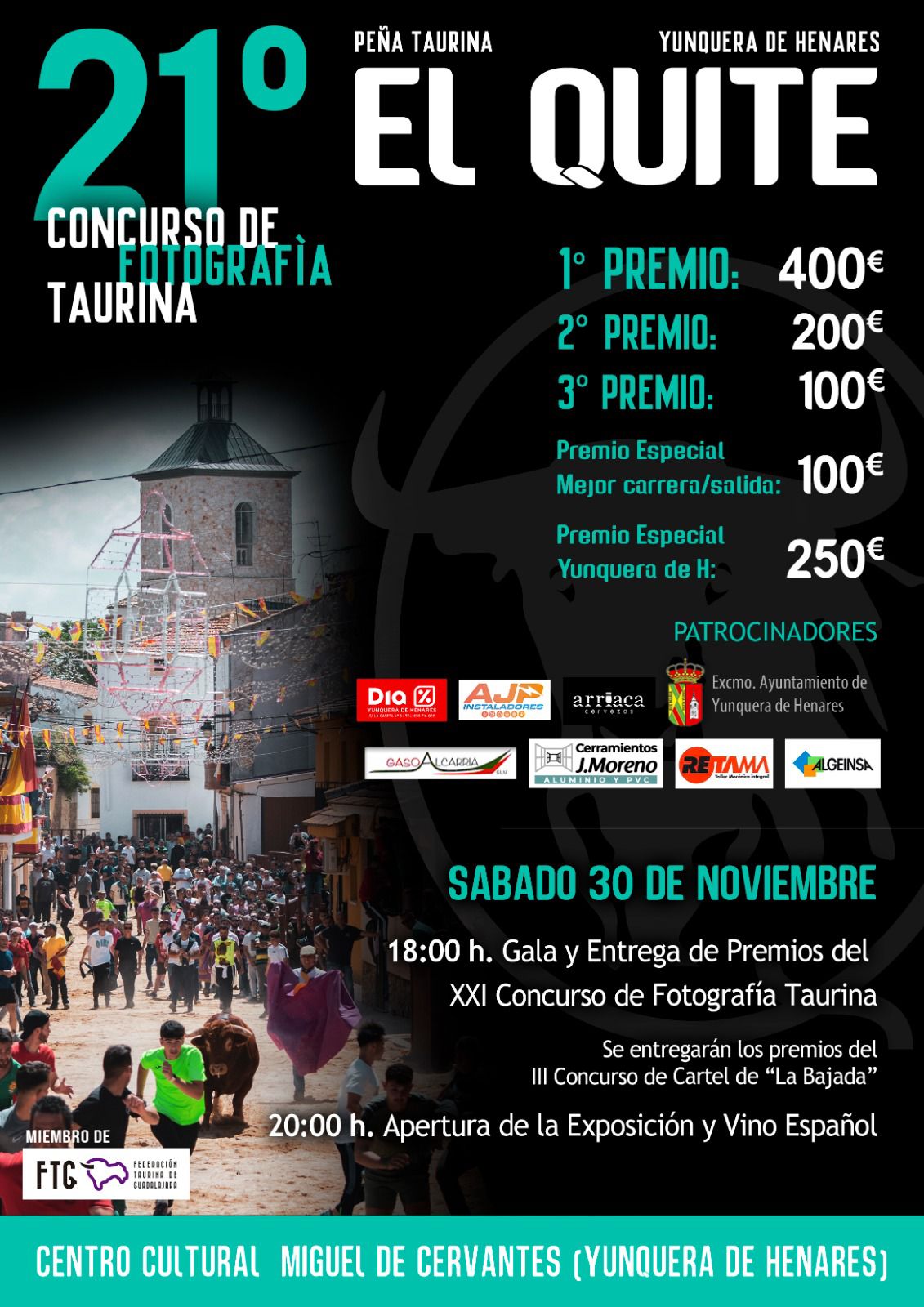 El próximo sábado 30 de noviembre desde las 18:00h en el Centro Cultural “Miguel de Cervantes” de Yunquera de Henares, la Peña Taurina ‘El Quite’ llevará a cabo la entrega de premios de su XXI Concurso de Fotografía, con una gala como siempre, llena de sorpresas y emotividad digna de un certamen pionero en nuestra provincia. Este año se repartirán más de 1000€ en premios divididos en cinco categorías.