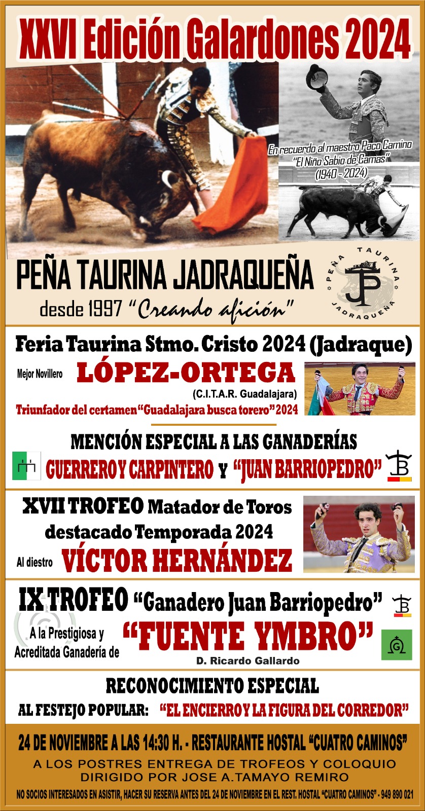 El próximo domingo 24 de noviembre, la Peña Taurina Jadraqueña, celebra la XXVI entrega de sus ya tradicionales galardones en el restaurante Jadraqueño “Cuatro caminos”, unos de los premios de mas prestigio dentro de la provincia alcarreña.