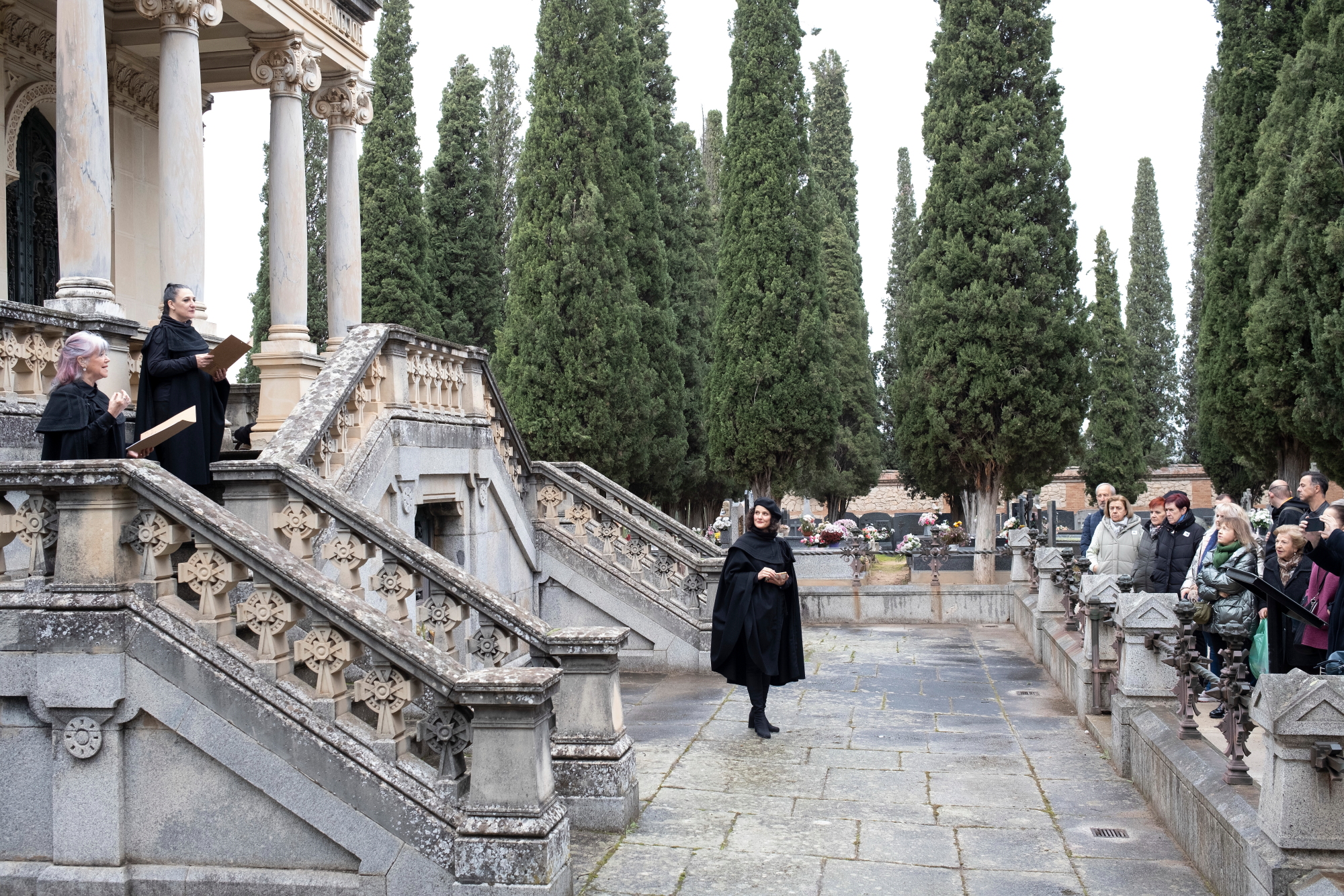 Se ha iniciado en la puerta principal del cementerio, atravesando después el Panteón Marqueses de Villamejor, el Torreón Alvar Fáñez, el Palacio del Infantado y el claustro del Palacio Antonio de Mendoza. Interesante recorrido por lo más característico de nuestro cementerio, viendo los monumentos funerarios más representativos del mismo. Se ha procedido a leer diferentes poemas en el monumento de los Marqueses de Villamejor, seguidamente una lectura de la leyenda-mito y realidad de la conquista de Guadalajara por parte de Alvar Fañez de Minaya en el torreón de su mismo nombre, posteriormente otra escena en la sala del Duque, en el Palacio del Infantado, y terminando en el claustro del Palacio Antonio de Mendoza donde hemos asistido a la última representación.