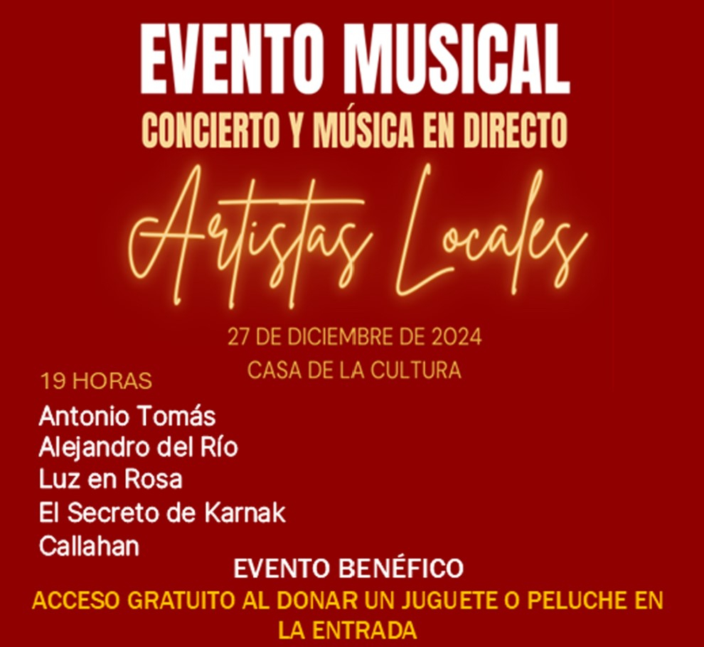 El concierto comienza a las 19.00 horas en el salón de actos de la Casa de la Cultura y sobre el escenario se podrá ver a Antonio Tomás, Alejandro del Río, Luz en Rosa, El Secreto de Karnak y Callahan.