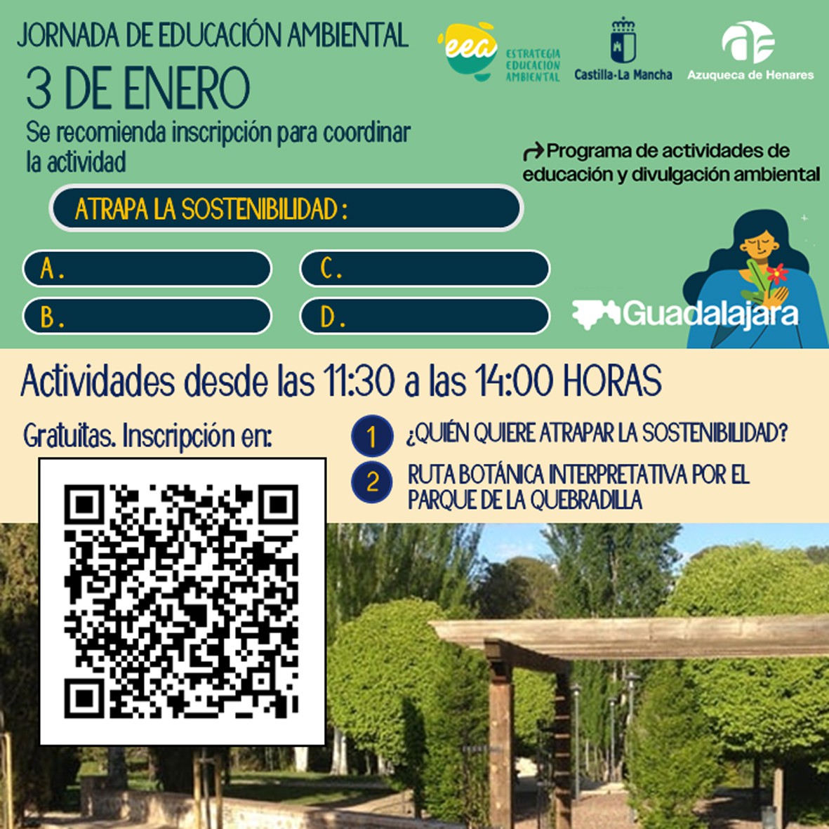 Este viernes, 3 de enero, el Ayuntamiento de Azuqueca de Henares llevará a cabo una jornada que incluye dos actividades destacadas: una ruta botánica en La Quebradilla y juegos medioambientales. Estas iniciativas forman parte del programa municipal de Educación Ambiental y están enmarcadas dentro de las actividades navideñas. La inscripción es gratuita y se puede realizar AQUÍ, o mediante un código QR disponible en la imagen promocional. Los participantes accederán al parque desde la avenida de Alcalá.