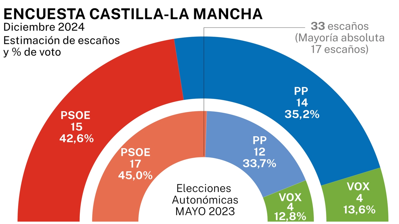 García-Page, reelegido en diciembre como secretario general del PSOE en su comunidad sin contestación alguna, pasaría de los 17 escaños obtenidos en mayo del 2023 a 15. Unos datos que, unido a la incomparecencia total de su izquierda (Sumar o Podemos), le impediría retener el mando en el Palacio de Fuensalida.
