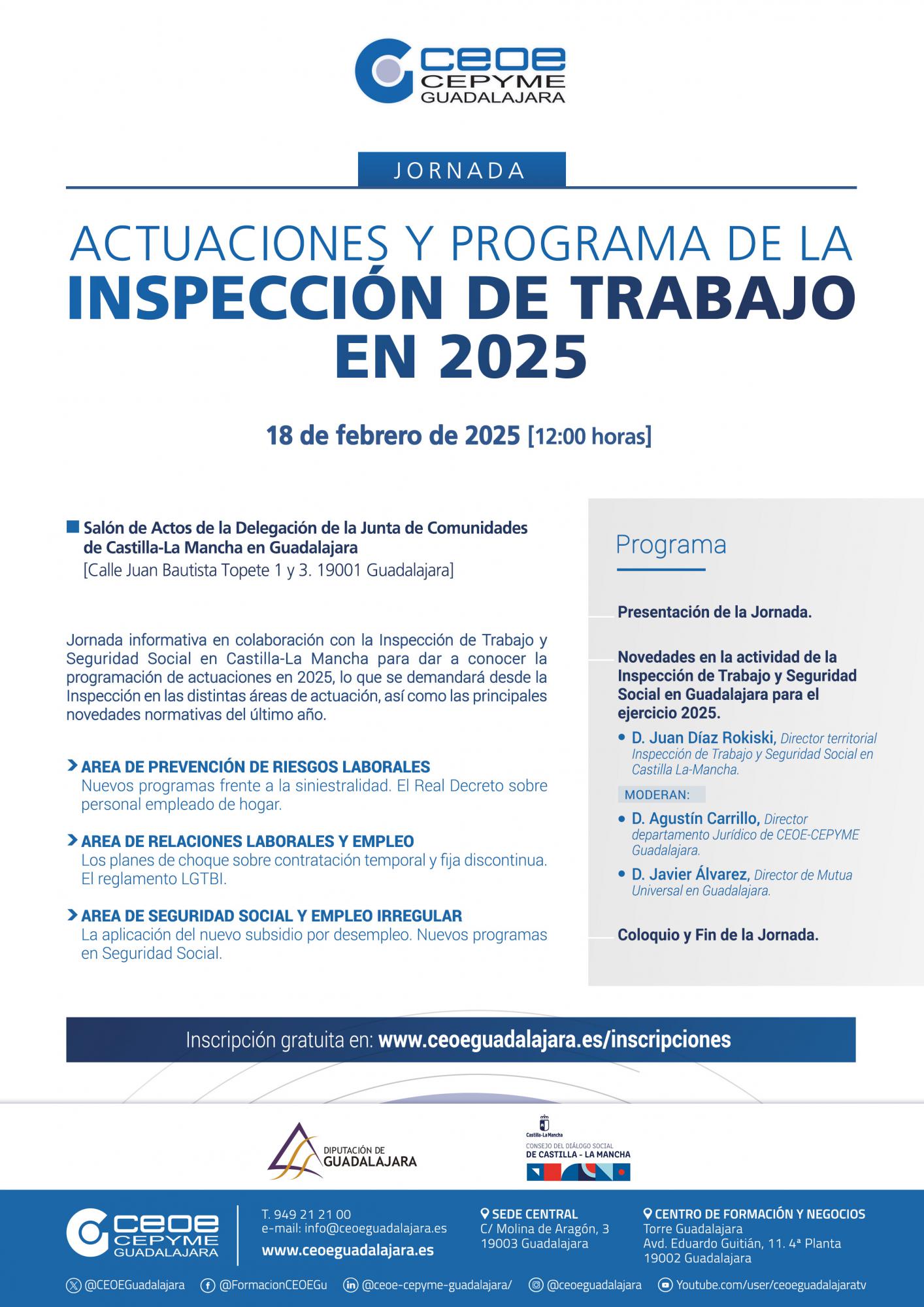 CEOE-CEPYME Guadalajara, en colaboración con Mutua Universal y la Diputación provincial de Guadalajara, junto con el consejo de Diálogo Social de Castilla-La Mancha, en el trabajo conjunto de difundir la normativa de empleo laboral o de la seguridad social, ha organizado para el próximo 18 de febrero una nueva jornada informativa, en esta ocasión, centrada en las “Actuaciones y programa de la inspección de trabajo en 2025”. La jornada tendrá lugar en el salón de actos de la delegación de la Junta de Comunidades de Castilla-La Mancha en Guadalajara, ubicado en la calle Juan Bautista Topete 1 y 3 de Guadalajara a las 12:00 horas.