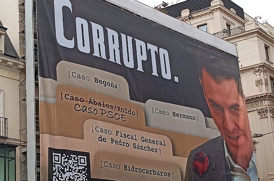 La organización Hazte Oír ha colocado una gran pancarta frente al Congreso de los Diputados, mostrando una imagen alterada del presidente del Gobierno, Pedro Sánchez, junto al término «Corrupto» en letras destacadas.