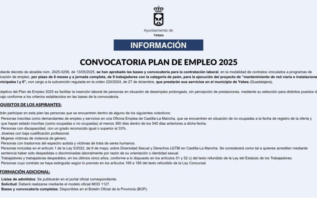 La Convocatoria del Plan de Empleo 2025, aprobada mediante decreto de alcaldía el 13 de mayo de 2025, busca contratar a 9 trabajadores en la categoría de peón para proyectos de mantenimiento en Yebes, Guadalajara. Los contratos tendrán una duración de 6 meses a jornada completa y están dirigidos a personas desempleadas, incluyendo colectivos vulnerables como personas con discapacidad y víctimas de violencia de género. La iniciativa tiene como objetivo facilitar la inserción laboral y se publicarán listas de admitidos en el portal oficial. Para más información y solicitudes, se puede consultar el Boletín Oficial de la Provincia.