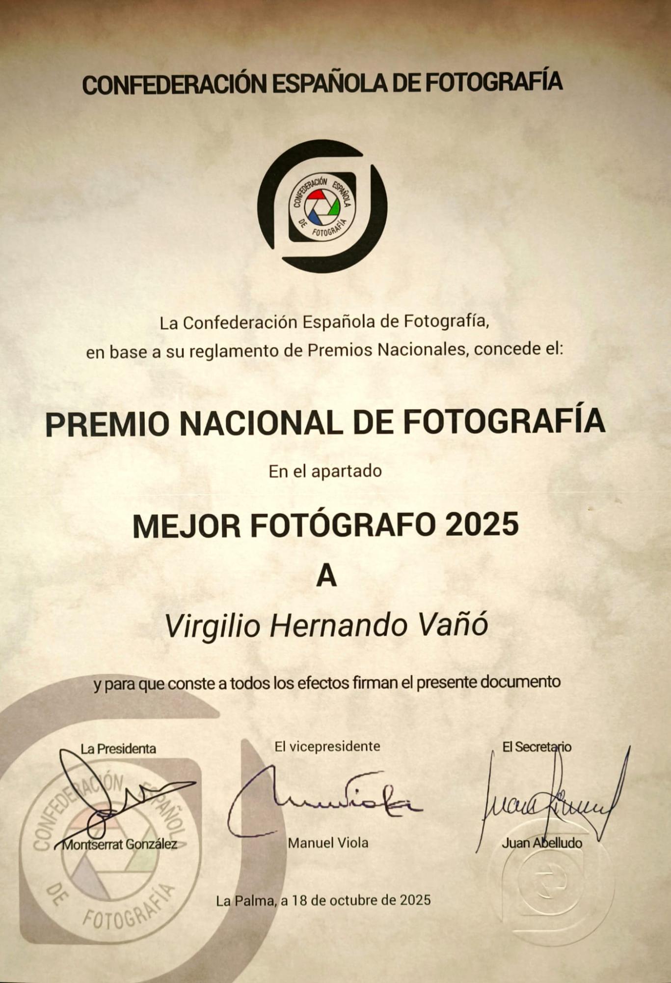 Virgilio Hernando Vañó, socio de la Agrupación Fotográfica de Guadalajara, ha sido reconocido con el Premio Nacional de Fotografía 2025, la más alta distinción otorgada por la Confederación Española de Fotografía (CEF), en la gala del XXXIX Congreso Anual que se celebró el pasado sábado 18 de octubre en el Teatro Circo de Marte, en la localidad isleña de Santa Cruz de La Palma. El galardón, entregado de manos de Riccardo Busi, presidente del la Fédération Internationale de l’Art Photographique (FIAP), y de Montse González, presidenta de la CEF, frente a más de doscientos fotógrafos y fotógrafas que han acudido a estas jornadas, procedentes de toda España, organizadas en esta ocasión por la Asociación Afoto La Palma.