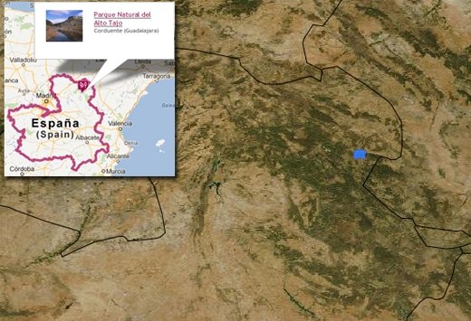 Imagen satélite (02/08/2012) del incendio en el Parque Natural del Alto Tajo en Guadalajara. Incendios registrados en las úlitmas 24 h.Fuente : LANCE-MODIS (NASA)